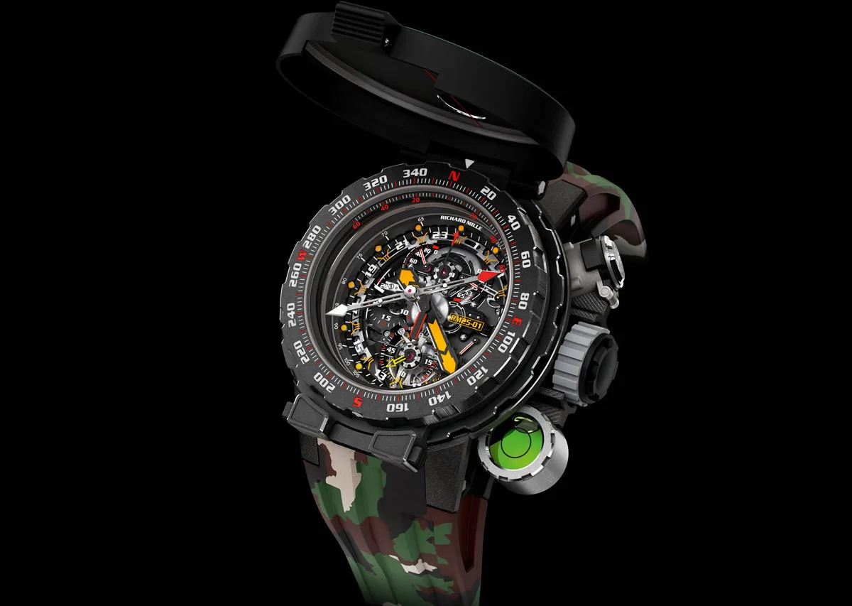 The strap is made of natural rubber and utilizes a camouflage pattern to further cement the explorer theme. Richard Mille has created quite a monstrous watch, no details are out yet about the dimensions, but just looking at the photos and seeing the amount of extra baggage put into the case, one can understand that this isn’t going to fit every wrist.