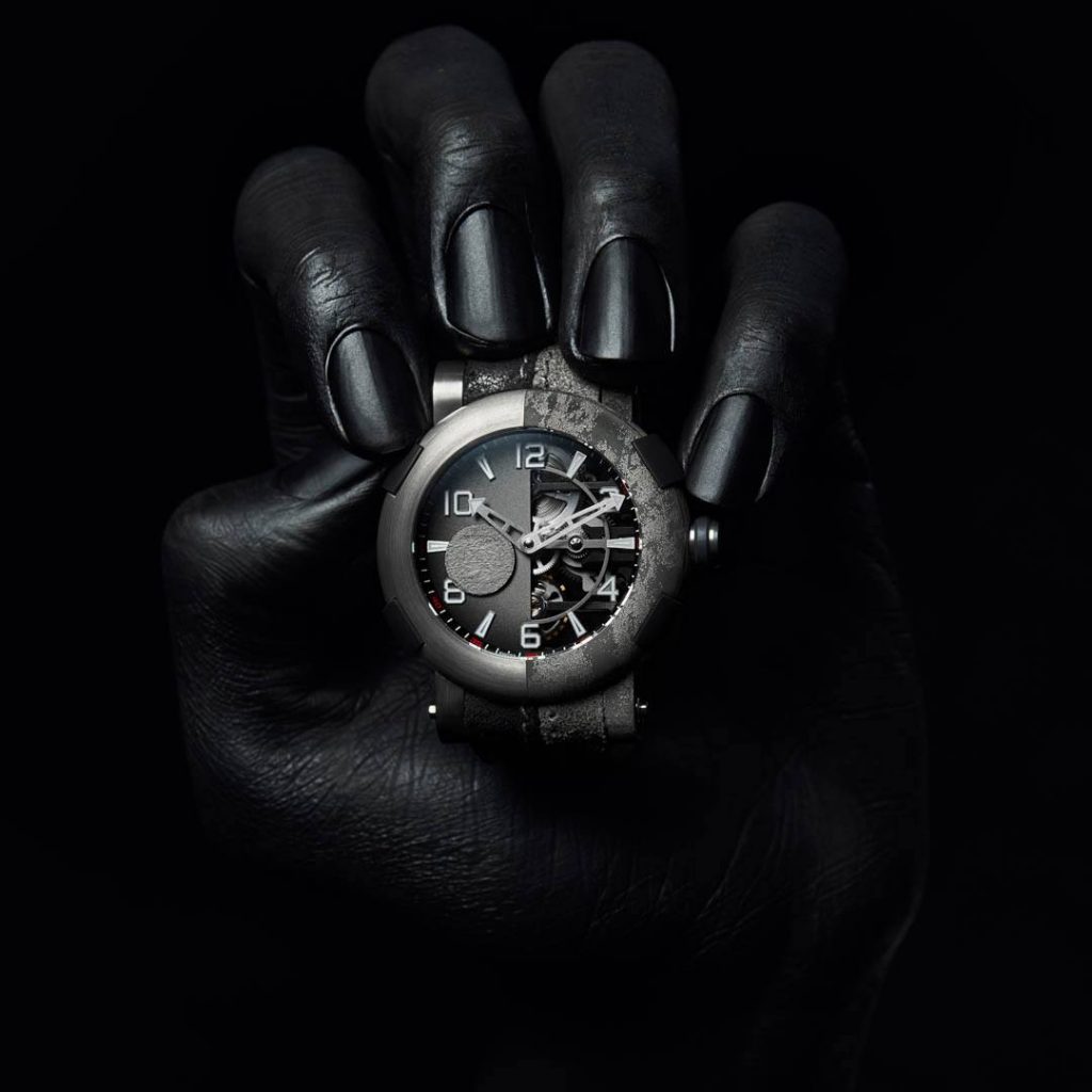 Moving on, the RJ Two-Face watch evokes the complicated and conflicted character of Gotham’s City’s district attorney turned villain. The watch pretty much uses a skeleton movement and distressed design cues to evoke the twisted physical and mental state of the mentally deranged criminal. The left side of the watch is neat while the right side exposes the three-layer skeleton movement much like the acid-burnt face of Harvey Dent.