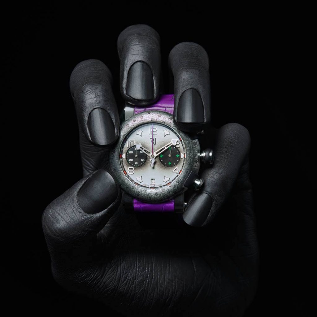 Ok, so the Joker is a playful watch, presented in a circular satin-brushed 45 mm titanium version of RJ’s new ARRAW case. It features four iconic rubber bumpers, handsome lugs and arrow-shaped hands. It’s crowned by a titanium bezel that is laser engraved with an intentionally chaotic Joker motif.