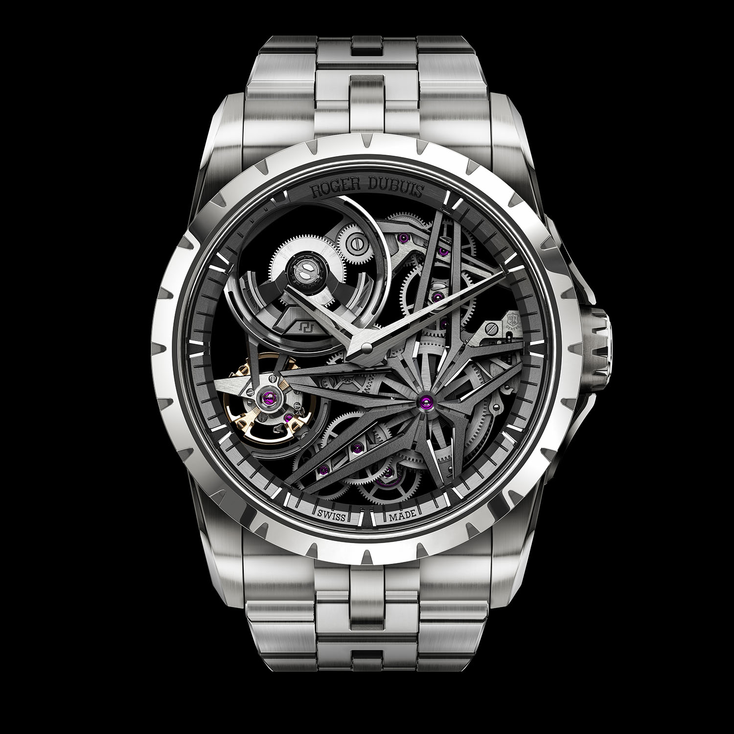 The exquisitely skeletonized dial of the Excalibur Monobalancier has a signature five-armed NAC-coated star on the right side, polished gray triangular-shaped hour markers with Super-LumiNova, and satin-brushed white gold hour and minute hands with Super-LumiNova tips. The skeletonized micro-rotor has been designed to minimize vibrations, and the new gear train and escapement optimization ensures optimal precision.