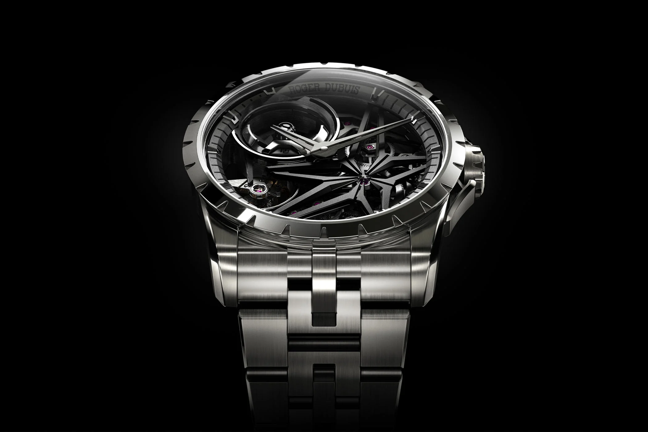The exquisitely skeletonized dial of the Excalibur Monobalancier has a signature five-armed NAC-coated star on the right side, polished gray triangular-shaped hour markers with Super-LumiNova, and satin-brushed white gold hour and minute hands with Super-LumiNova tips. The skeletonized micro-rotor has been designed to minimize vibrations, and the new gear train and escapement optimization ensures optimal precision.