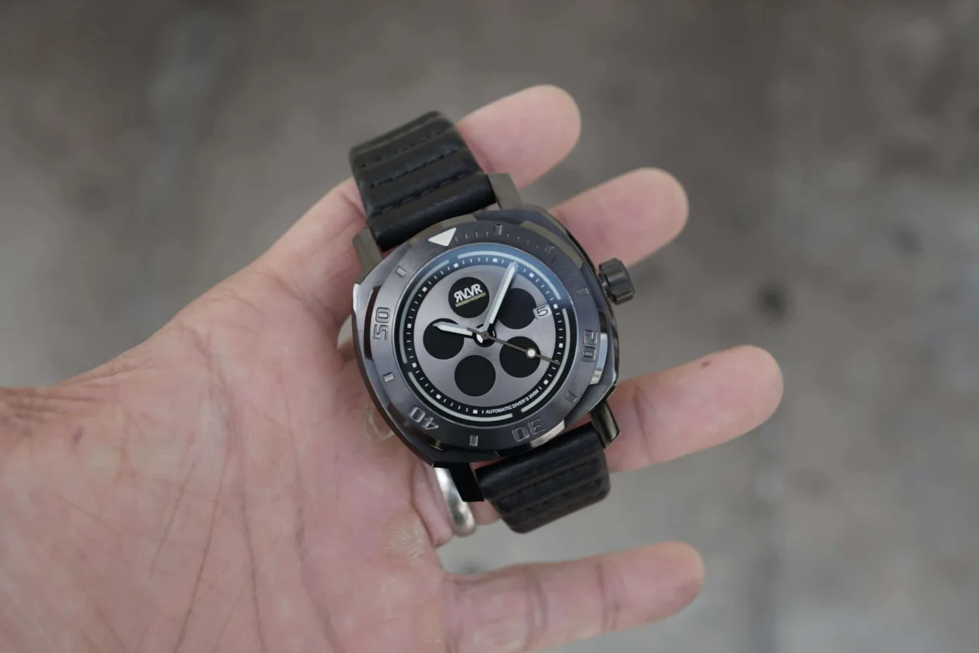 RVLVR is a small watch brand based in Hawaii and makes watches that are influenced by handguns/revolvers. For the AD5 RVLVR has partnered with leading arms manufacturer Magnum Research and has drawn inspiration from their most powerful single action 5 chamber revolver called the Biggest Finest Revolver aka BFR. One of the most noticeable aspects of the AD5 are the 5 black circles that have been designed to mimic the bullet chambers found on a BFR. This little detail adds a distinctive visual appeal to an otherwise clean-looking dial which has been crafted from brass, a material used in the construction of bullet frames. Legibility is an important aspect on a dive watch and the AD5 offers plenty of it, be it day or night.