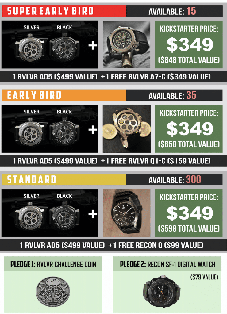 The RVLVR AD5 is a feature-rich dive watch with an intriguing design influence. The watch would be made available in two variants: Stainless Steel with a black rubber strap and a Black version with a leather strap. Super early bird pricing starts at $349, which is a good $150 less than the final retail price of $499. Also, what makes this Kickstarter campaign even more special is that almost every reward gets you not only an AD5 at a discounted price but also an additional RVLVR watch for free, if you are among the first 350 backers. So, in case you really want the AD5 to be a part of your watch collection, act fast to enjoy the maximum benefits.