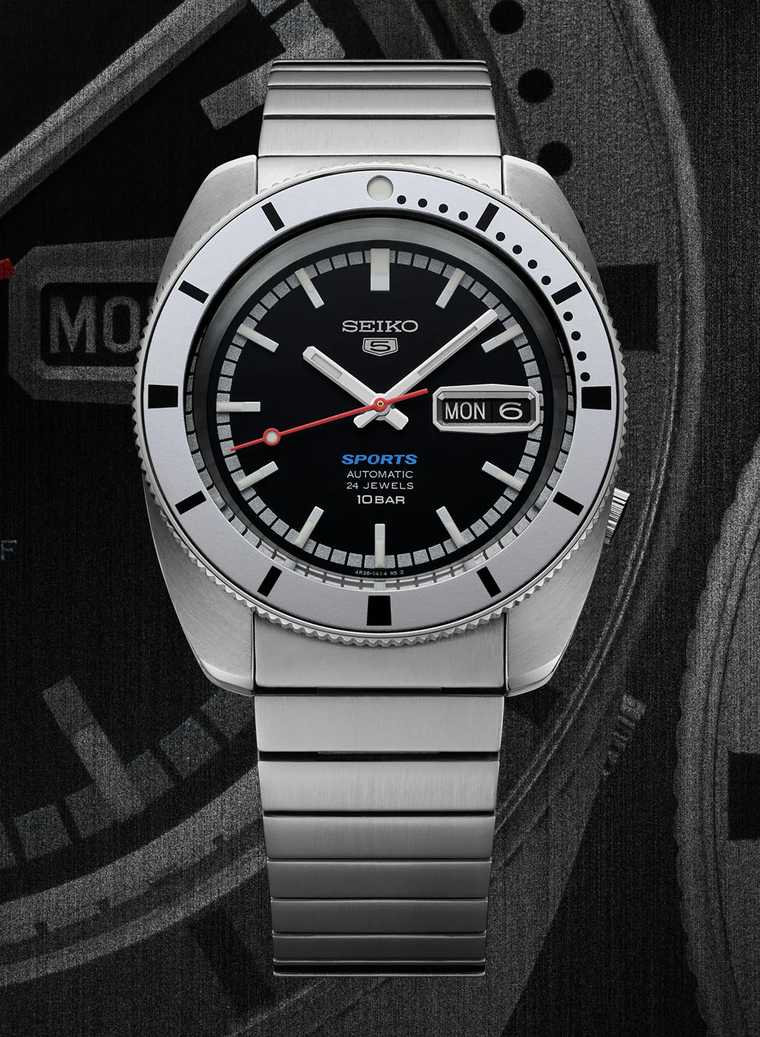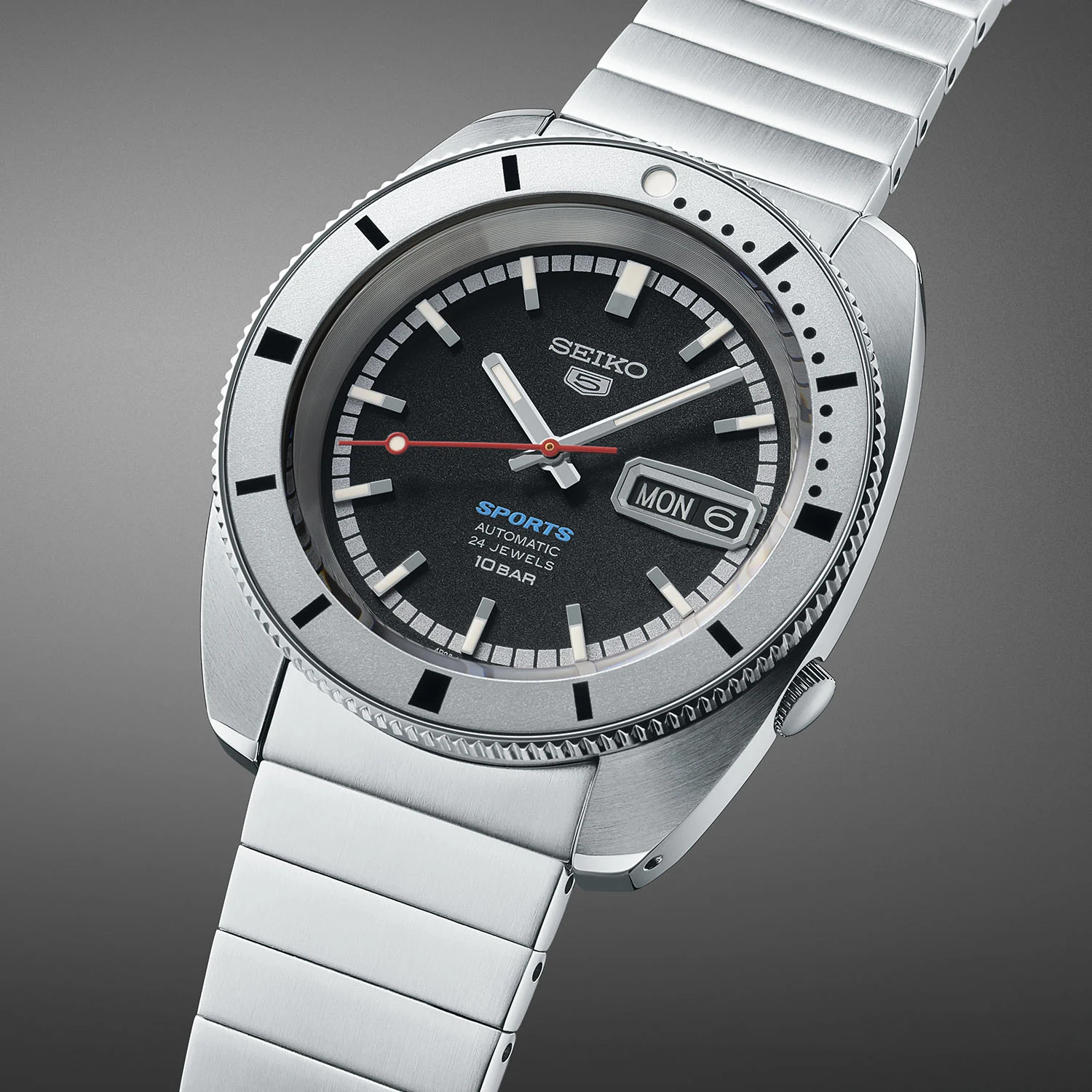 The watches feature vintage-inspired dials: silver brushed (SRPL03) and matte black (SRPL05). Both have baton markers with LumiBrite, straight hands, a red lollipop seconds hand, a uniquely shaped day-date window, and the classic Seiko 5 logo.