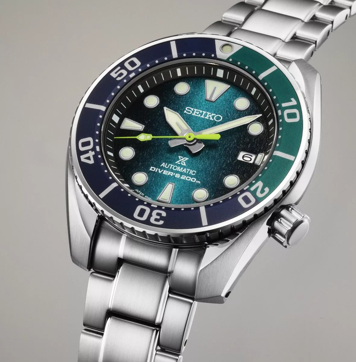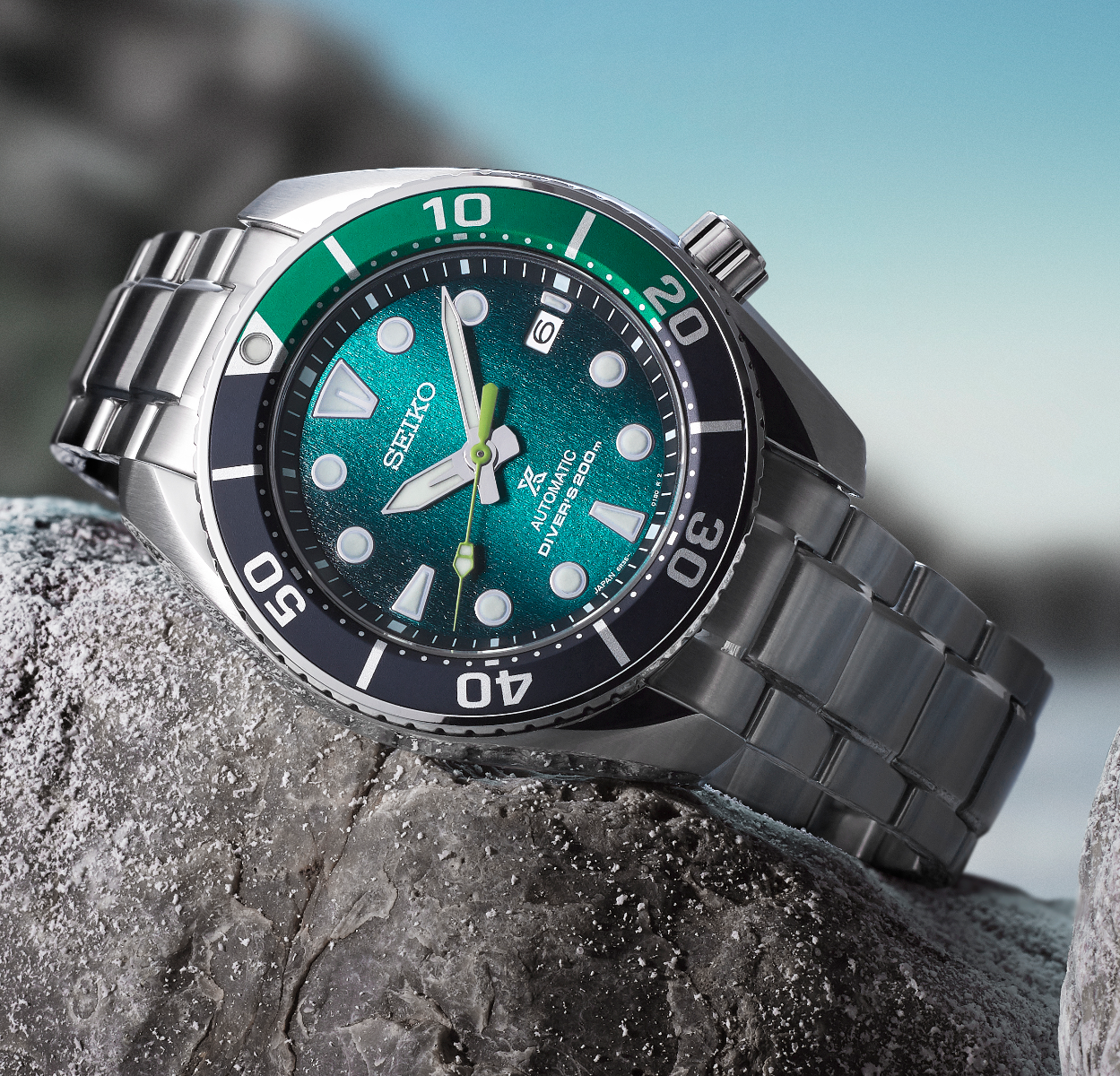 The unique barrel-shaped stainless steel case of the SPB431 is robust and measures 45 mm in diameter and with a slim profile of 12.9 mm, echoing the iconic “Sumo” line. Designed with a contemporary silhouette, the watch boasts a screw-down crown strategically positioned at 4 o’clock, which helps to ensure a water resistance of up to 200 meters (20 bar). The two-tone blue and dark green aluminum colorway on the bezel insert pays homage to the Silfra Fissure, and this happens to be the only place on Earth where divers can touch both Eurasian and American continents simultaneously due to the narrowness of the fissure.
