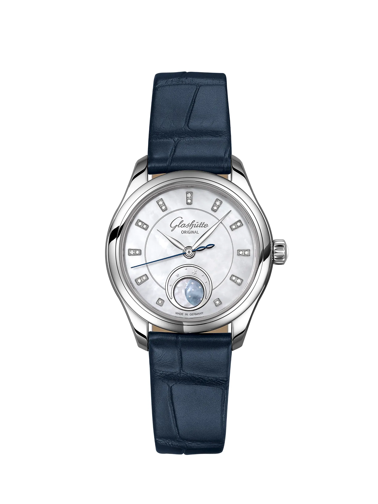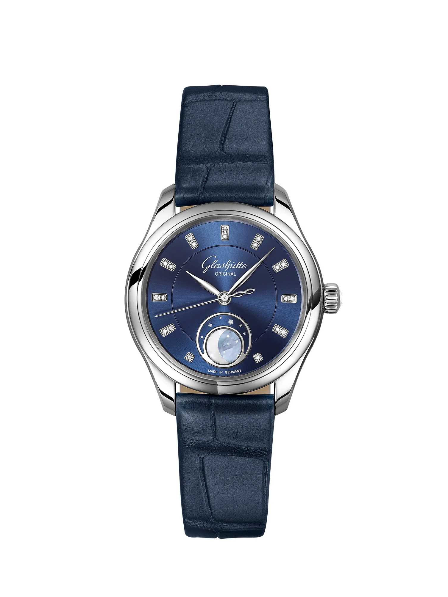 The Serenade Luna comes with a variety of strap options to suit your style. The stainless steel models can be paired with a sleek stainless steel bracelet or a sophisticated blue alligator leather strap. The red gold model features a luxurious green alligator leather strap that perfectly complements the golden-green dial. All straps are interchangeable, allowing for effortless customization. Prices for the Serenade Luna collection begin at EUR 10,900 for the stainless steel model with a blue dial and leather strap. The diamond-set models and the red gold version naturally command a higher price tag, reaching up to EUR 23,900. The Serenade Luna collection is now available for purchase at authorized Glashütte Original retailers worldwide.