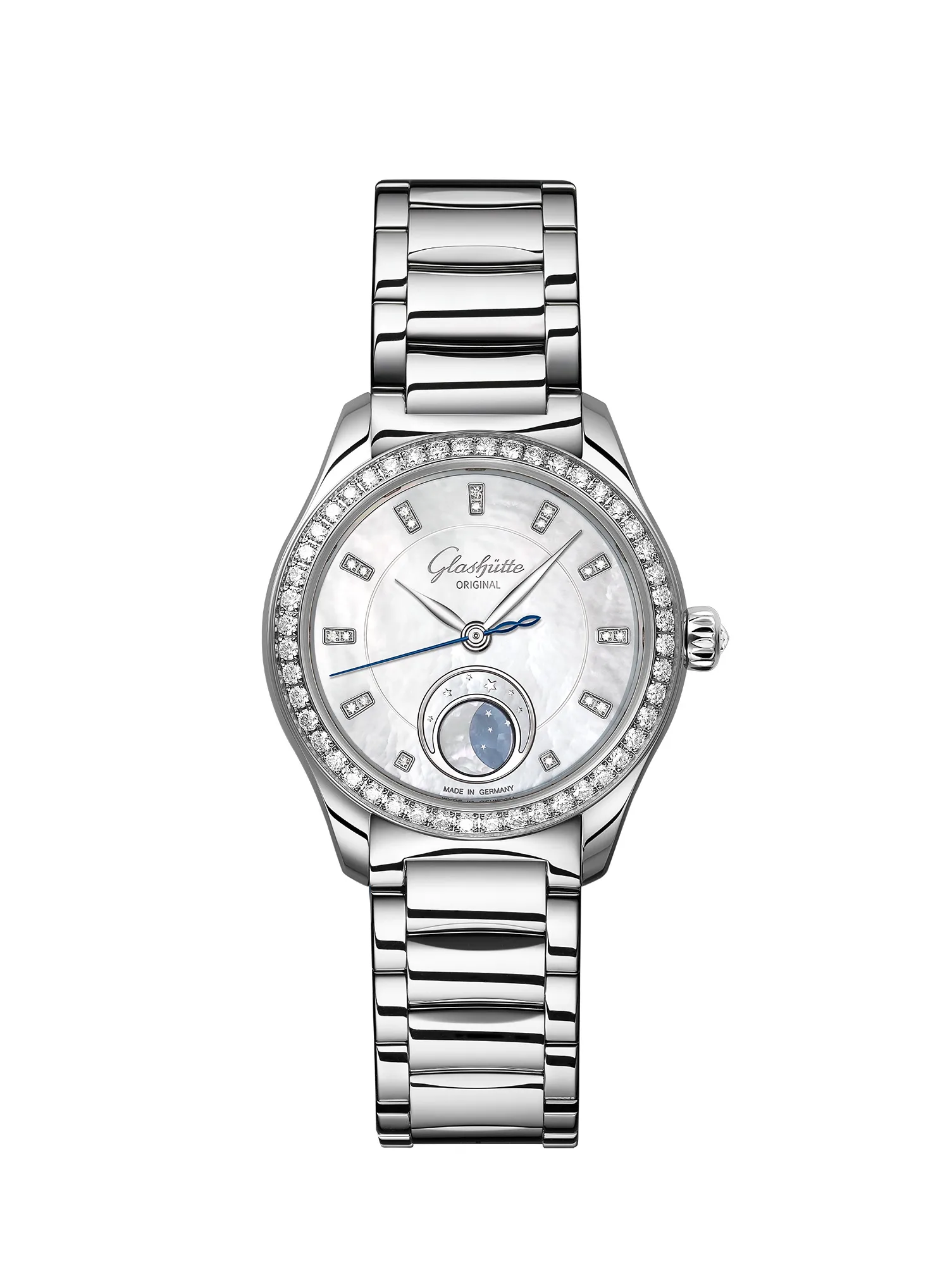 The dial of the Serenade Luna is a captivating canvas showcasing Glashütte Original’s meticulous craftsmanship. For the stainless steel models, there’s a choice between a sunray blue dial or a white mother-of-pearl dial. The red gold version takes a more opulent route with a stunning golden-green sunray dial. Regardless of the dial color, all models boast luminous white gold hour markers adorned with 20 brilliant-cut diamonds. The star of the show, however, is undoubtedly the moon phase complication at the 6 o’clock position. Framed by a crescent-shaped structure embellished with stars, a disc of iridescent mother-of-pearl depicts the moon in a star-studded night sky. The night sky itself is a work of art, crafted with either dark Tahitian mother-of-pearl (red gold model) or a deep blue lacquer (steel models) beneath the mother-of-pearl, creating a serene sense of depth.