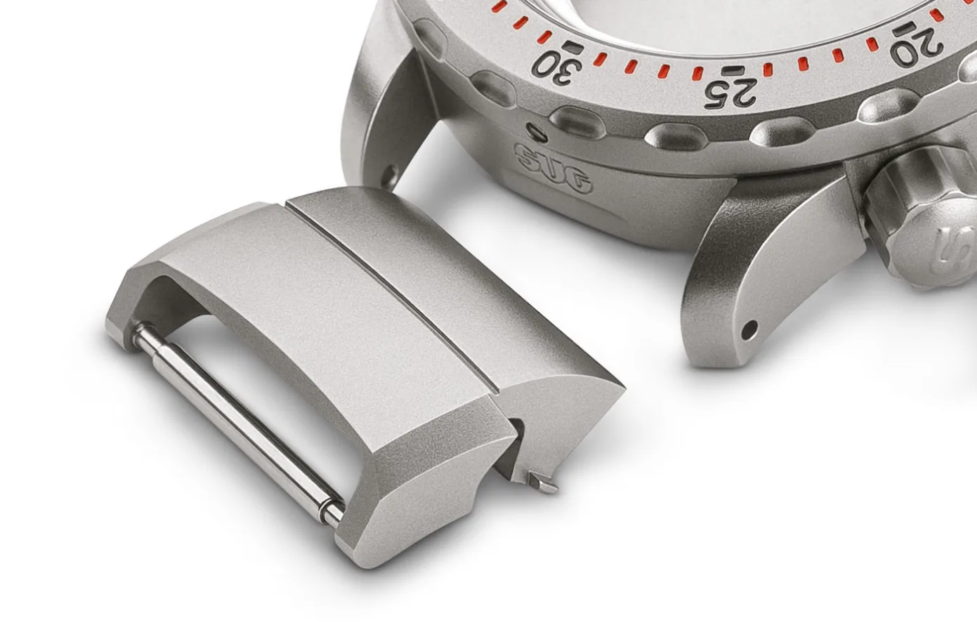 According to Sinn when held in position the hooked strap offers the same security as a regular strap attached with a bar, but this system allows you to quickly swap straps based on the length required for the dive or simply based on which colour you’d like.Â