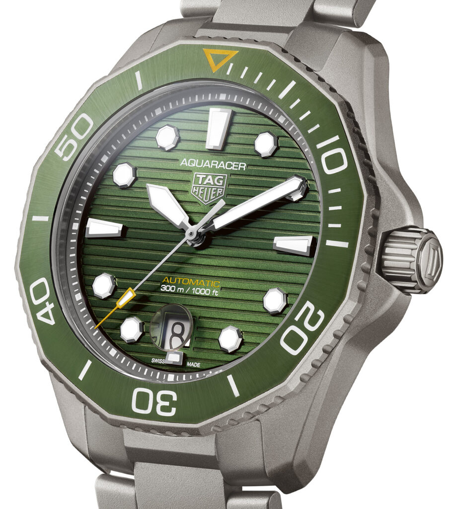 The case on the Aquaracer Professional 300 watches still measures 43mm in diameter and maintains a familiar angular geometry. However, like the dial, the case gets some refinement. While the regular Aquaracer models feature fully polished sides, the case on these new watches comes with brushed sides and a smooth polished bevel that flows through the sides, all the way down to the lugs. Another notable update to the case comes in the form of the bezel on top that now features a coin edge pattern for better grip and the bezel insert is also ceramic for better scratch resistance. The case is still water-resistant to 300 meters and is being offered in different choices of materials. The blue, black, and silver dial variants get a stainless-steel body, the green dial variant gets a grade 2 Titanium case and finally, the Tribute to 844 version gets a case made from lightweight grade 5 titanium.