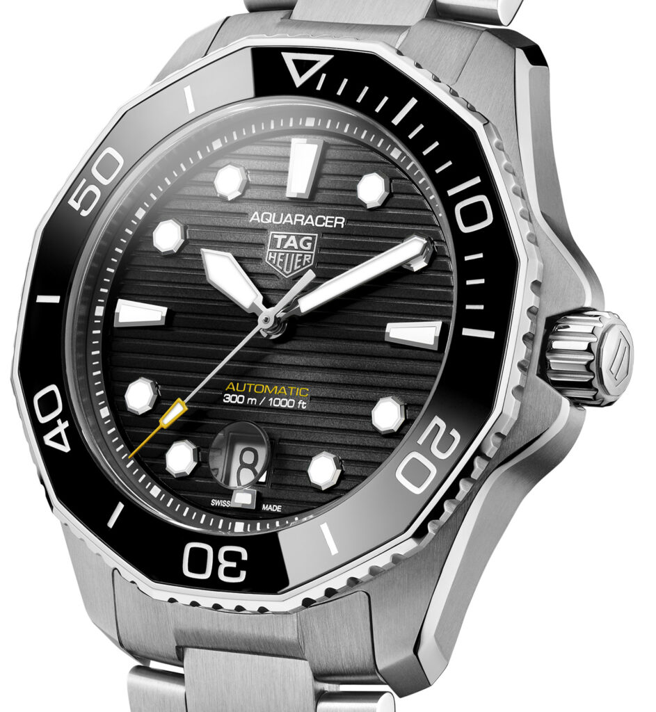 The biggest noteworthy change on the new Aquaracer Professional 300 watches can be seen on the dial, which is now more refined and balanced. Two things drive this change. First and foremost is the scale and shape of the indices and the hands. The indices are now smaller and have now been presented as a combination of applied octagons and trapezoids. The hour and minute hands now have a sword-style shape instead of the batons seen on the existing models.