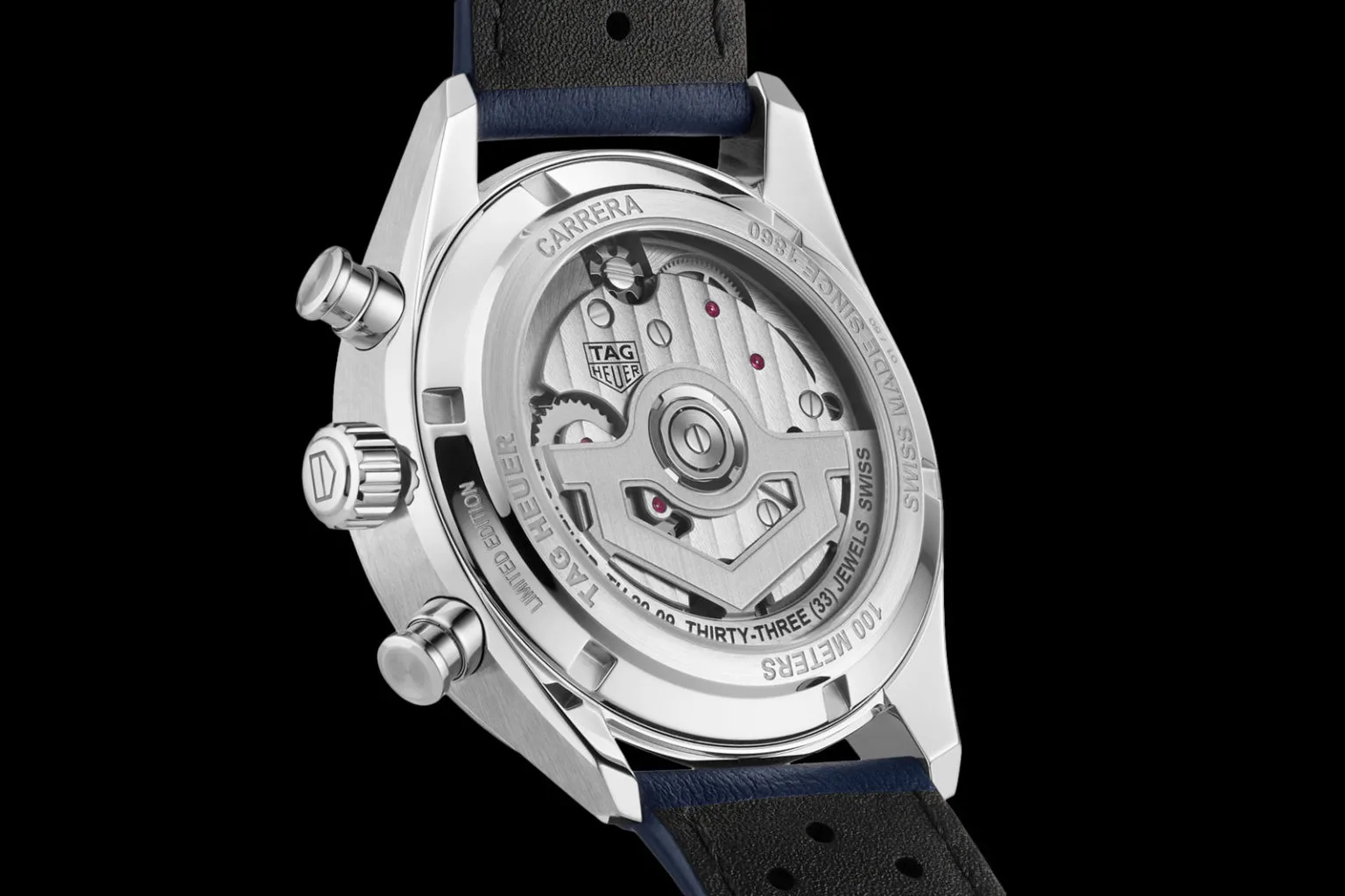 Powering the Carrera “Blue Panda” is the in-house automatic Calibre TH20-09. Visible through the sapphire crystal caseback, this COSC-certified movement beats at 28,800 vibrations per hour (4Hz) and offers a 65-hour power reserve.