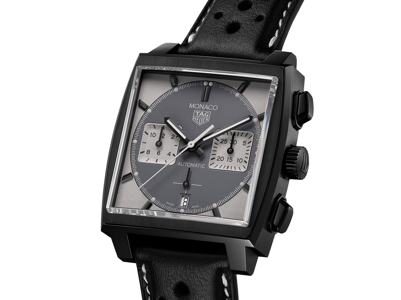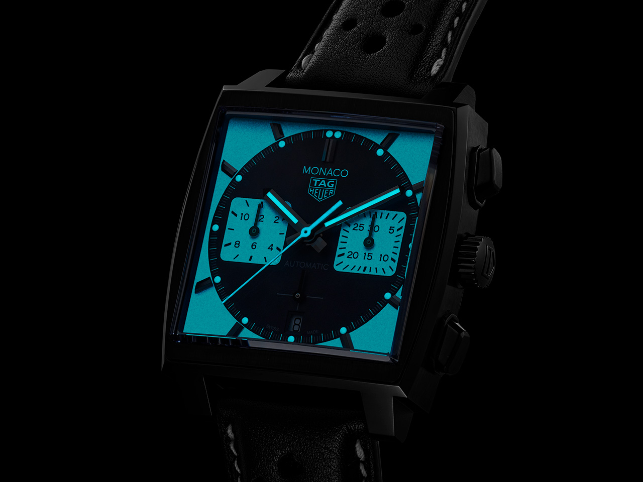 That dark coating is matched to the hands, which sit atop a matte grey dial with white detailing including white square subdials. The classic Monaco formula has been followed here with square subdials inside a round dial inside a square watch. The real draw of this piece, though is the lume. The hands (including the chronograph seconds hand) glow in the dark, as do the pips by the hour markers, pretty standard stuff. The extra lume comes in the form of the subdials, of which the white backdrop also glows. Finally, all the space between the round dial and the square case is also lume and so glows in the dark in spectacular fashion. I appreciate it when brands get clever with their designs instead of putting out yet another limited edition or another dial colour with little regard for anything else.