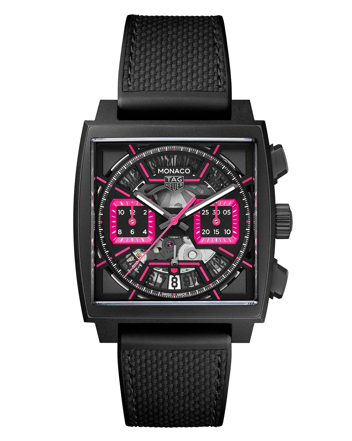 TAG Heuer Monaco Chronograph Skeleton Pink comes on a strap having a combination of black embossed calfskin leather and rubber, with an MSRP of CHF 11,000.