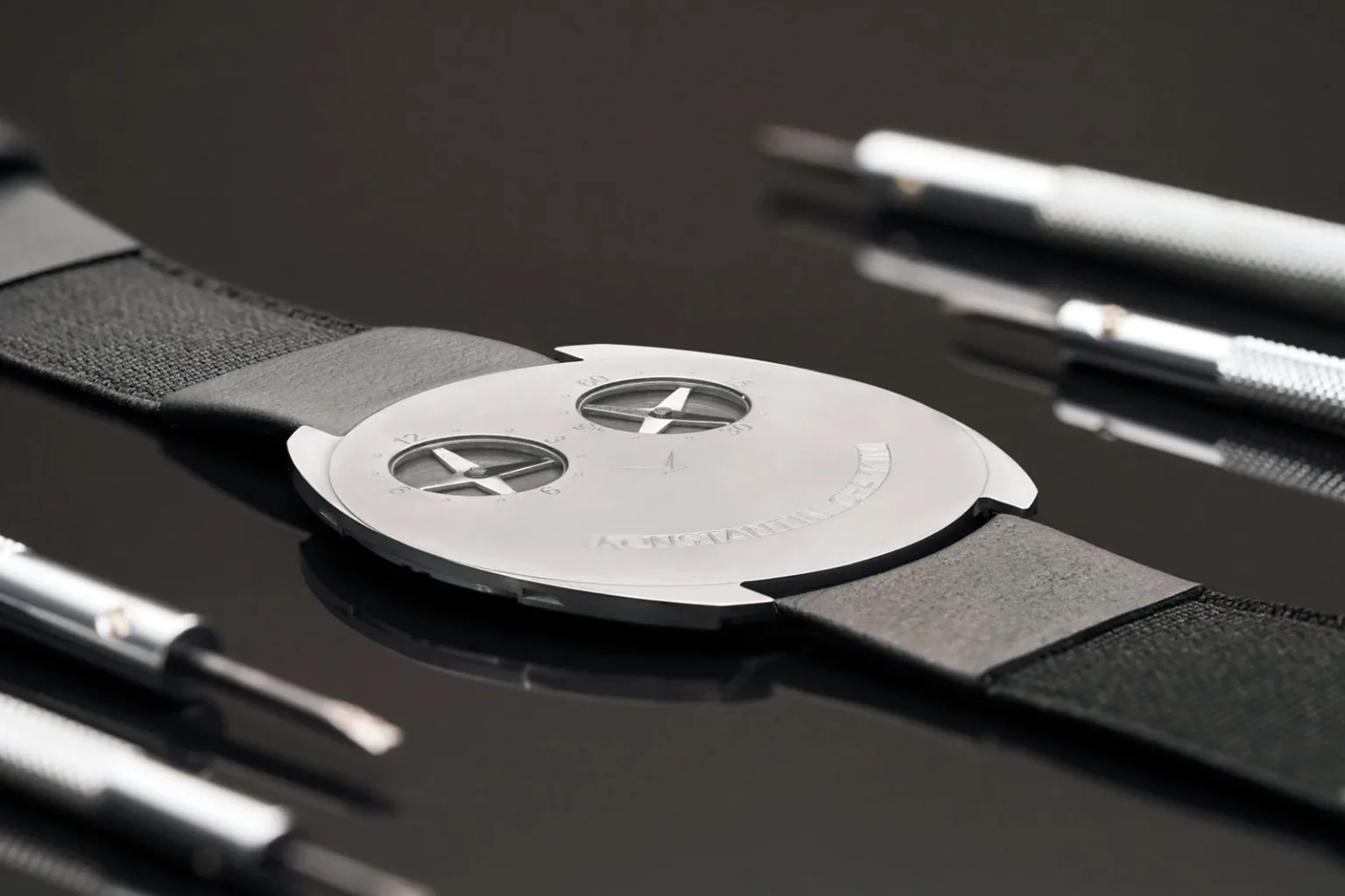 To achieve that 1.65mm thickness and make the watch wearable, Konstantin Chaykin changed his approach. As with other ultra-thin watches, the back plate of the watch’s case is also the baseplate of the movement, with only one plate over the top to seal it all in. Also, the movement’s design splits the watch’s balance wheel and escapement assembly (which are usually one atop the other), although details are a little hazy on how that works. A re-designed mainspring barrel is also in place, although due to the extreme dimensions of the watch, it has only around 32 hours of power reserve, but more on how Konstantin Chaykin deals with that in a moment. Also, a special kind of stainless steel has been employed to give this watch extra rigidity, and even the leather strap uses titanium and elasticated components which spread the load over the entire watch and strap, this aims to combat the issue of the ultra-thin case bending when worn.
