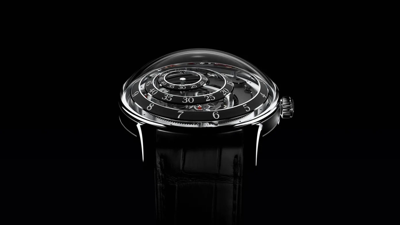 Trilobe is a relatively new independent brand that released its first watch in 2018, although the brand itself was born in 2013. The Les Matinaux was Trilobe’s inaugural piece and really set the tone for things to come. It displayed time via three open discs for hours, minutes and seconds, which rotated around the dial in a two-dimensional setup. The dial resembled a Spirograph used to draw geometric designs. The latest Une Folle Journée at Watches & Wonders transforms this two-dimensional design into a three-dimensional “exploded view” of time with angled discs floating above the dial within a huge sapphire dome.