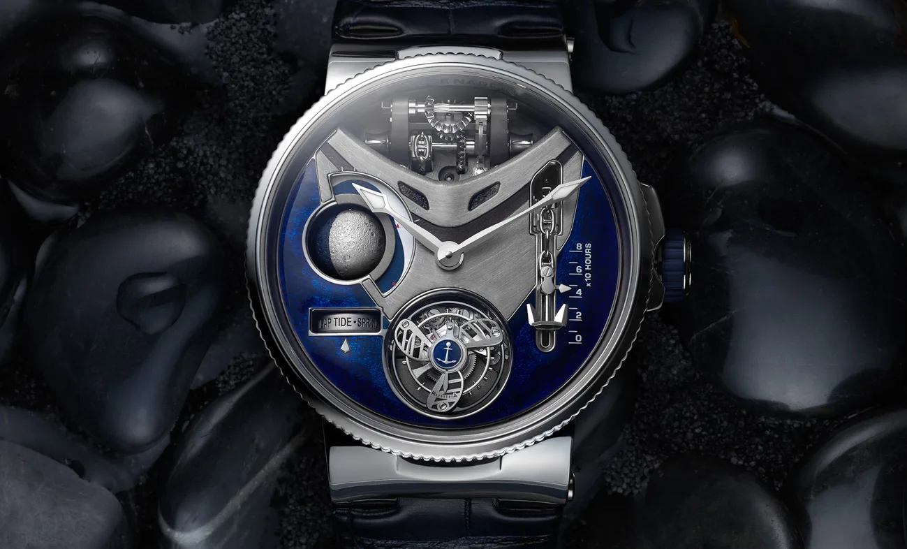 On the opposite side of that is perhaps my favourite part of the watch. These connect to the moonphase, a 3D engraved moonphase with a representation of the surface engraved onto it. One side has been blue PVD coated, the other given a rhodium treatment. It’s connected to a wraparound cutout which indicates the tidal coefficient (the height difference between consecutive high tides and low tides, click here for more) and a small cutout below that shows tidal volume (the difference in water between low tide and high tide). Before GPS, maps, charts and star tables were some of the essentials needed for maritime enthusiasts and skippers alike, knowing the tides is key to this day.