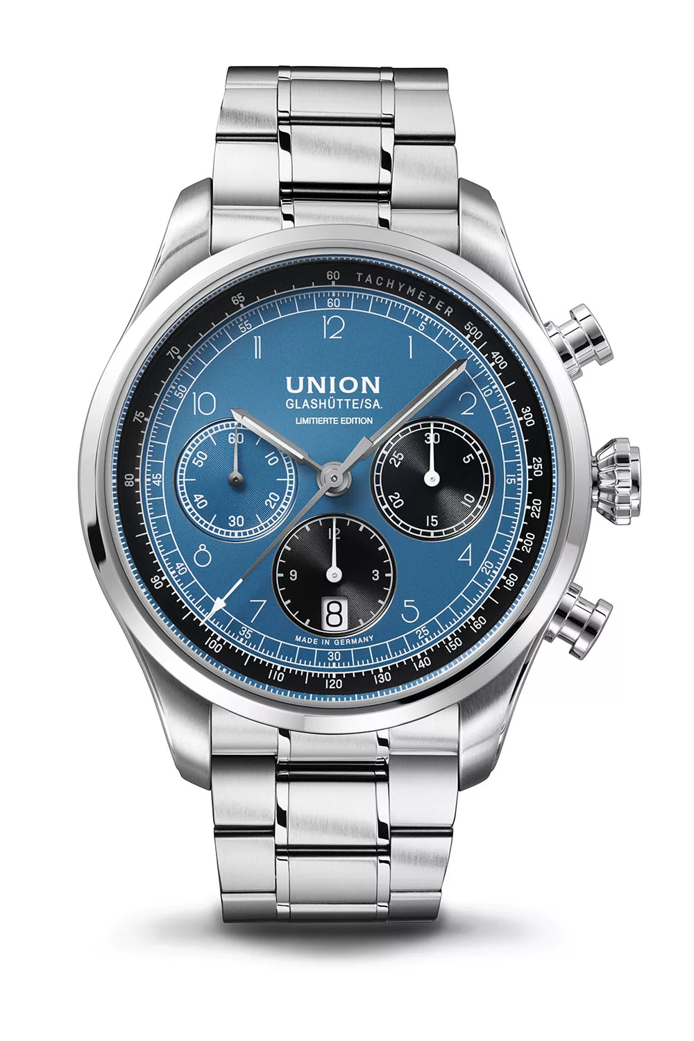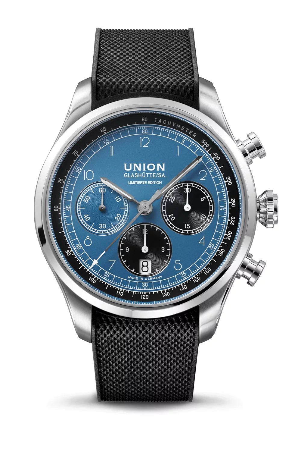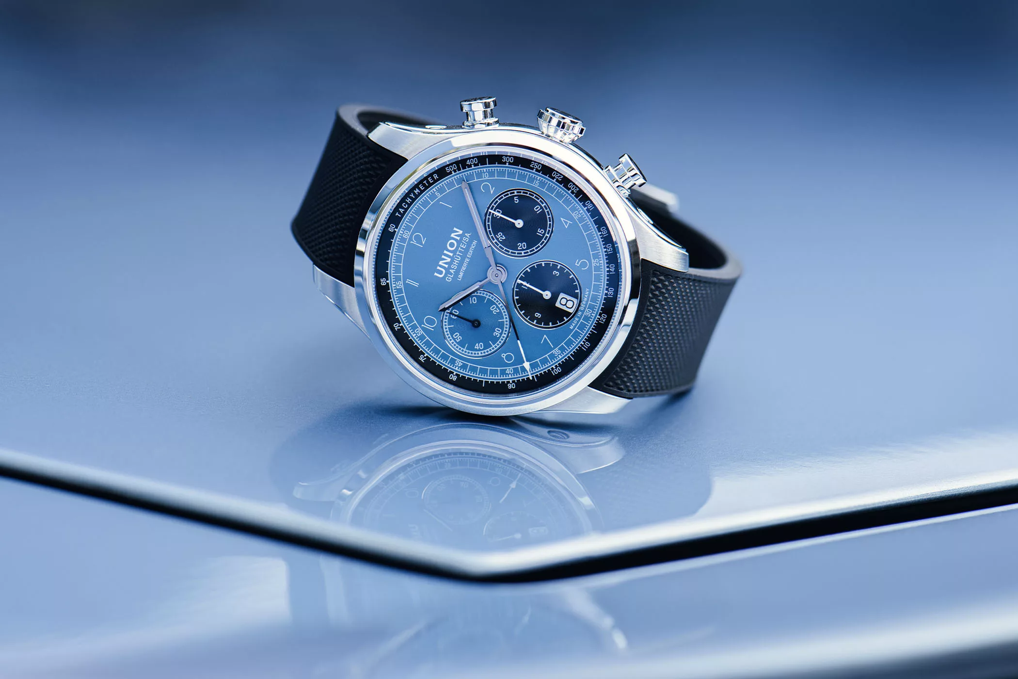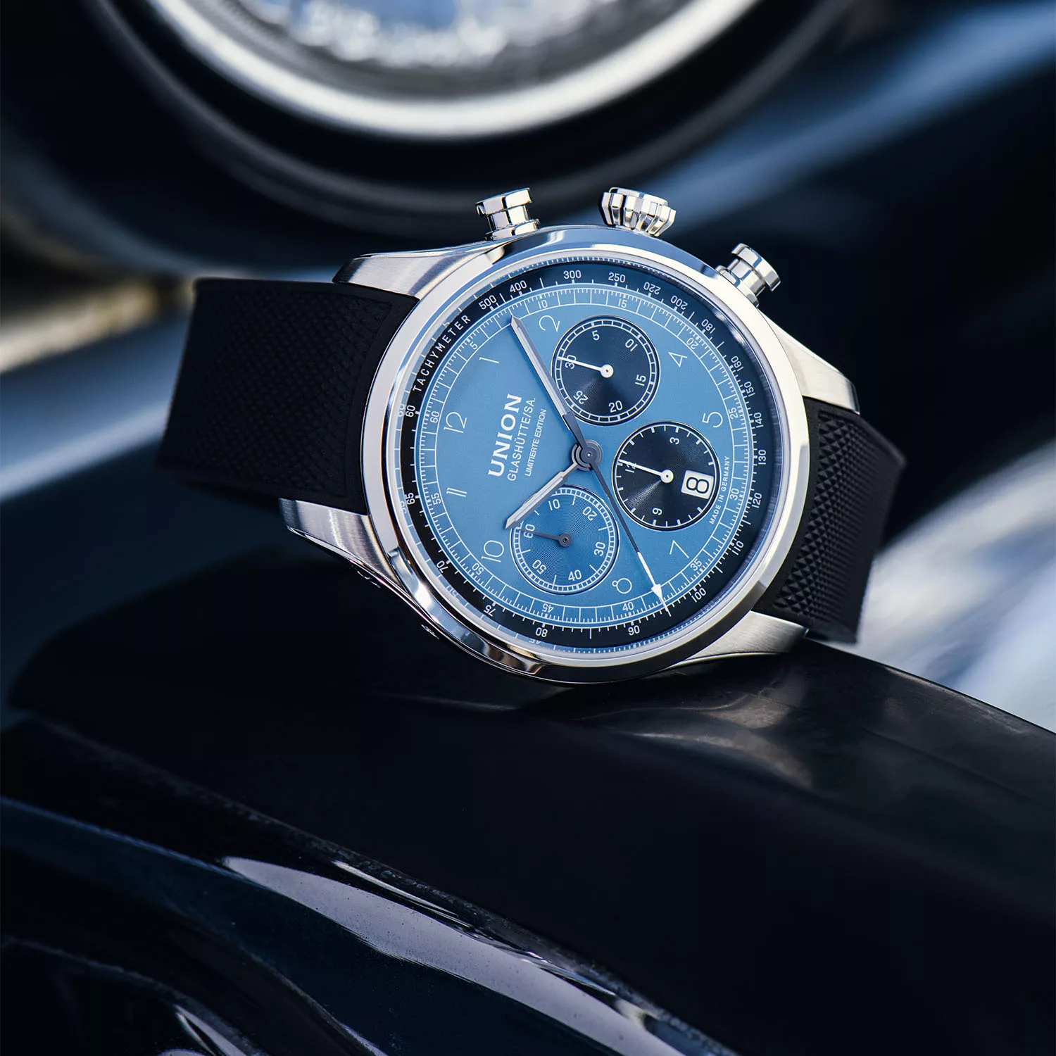 The striking ‘electric blue’ dial, aptly named by Union Glashütte, complemented by black sub-dials reminiscent of the iconic car’s grille, is a clear nod to the enchanting dashboards of 1970s sports cars, revving up the vintage car aesthetic. The retro railway minutes track and black tachymeter scale with white markings further enhance the dial’s visual appeal. A subtle Art Deco-inspired font adorns the Arabic hour numerals, creating an elegant contrast. The dial also features a date window housed within the 12-hour counter, offering practical functionality.