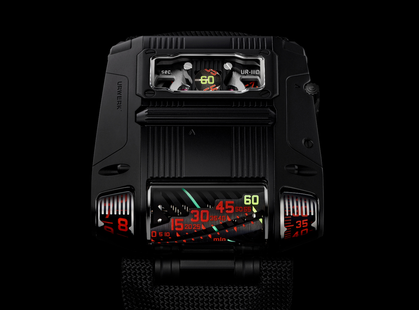 Moving on to the display, akin to the UR-111C, the Black Cobra uses multiple windows to tell the time. There is a primary display in the front comprising of three individual sections which beginning from the left display the jumping hours, linear retrograde minutes and minutes again. Yes, you read that right there are 2 windows that tell the minutes which is strange, but it blends well within the overall design and is something one would get used to with passage of time. And finally, on top of the case is another exhibition glass which gives a nice view of the running seconds meandered across a cluster of optical fibers. While the display is actually similar to the one found on the UR-111C, what makes it intriguing is the choice of colors that URWERK has made use of in case of the Black Cobra. The heavy usage of bright red along with fluorescent green accents adds to the sporty appeal of the watch and provides a great contrast against the black case.