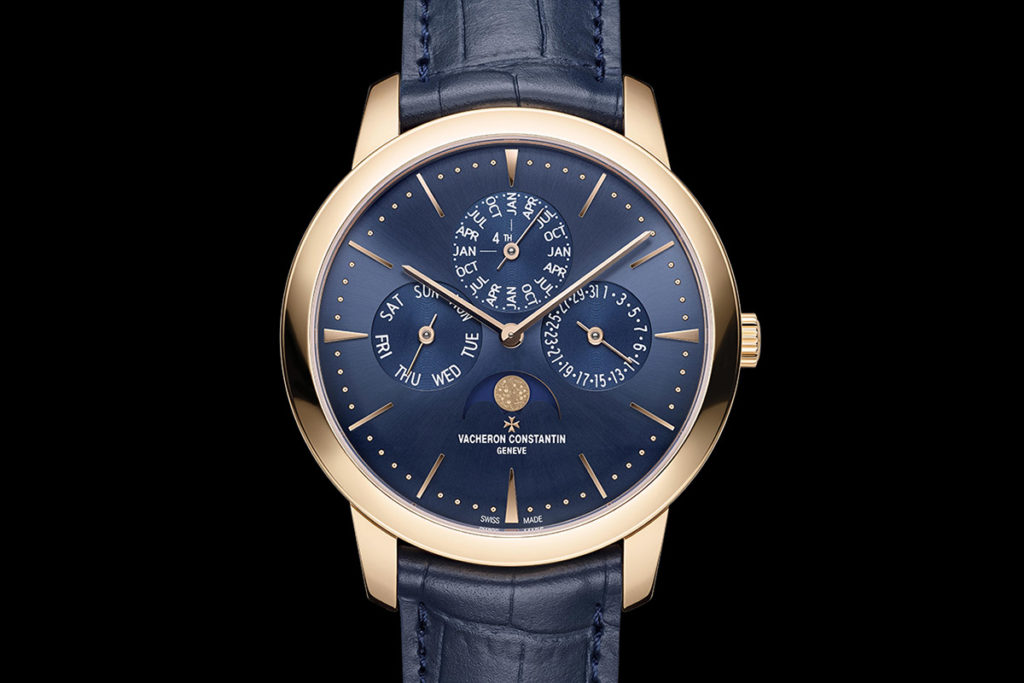 The pink gold case is 41mm in diameter, so it’s quite modern in terms of dimensions. The ultra-thin case is 8.96mm thick, and the movement itself is a remarkable 4.05mm thick. The watch features a warm colour of gold mixing with a cooling blue, to create a modern appearance which is sure to please. The dial layout follows the way of the Patrimony collection. It makes the complicated perpetual calendar beautifully simple. I particularly like the long, thin hands which remain attractively simple, the markets are simple as well, and there are no running seconds either.