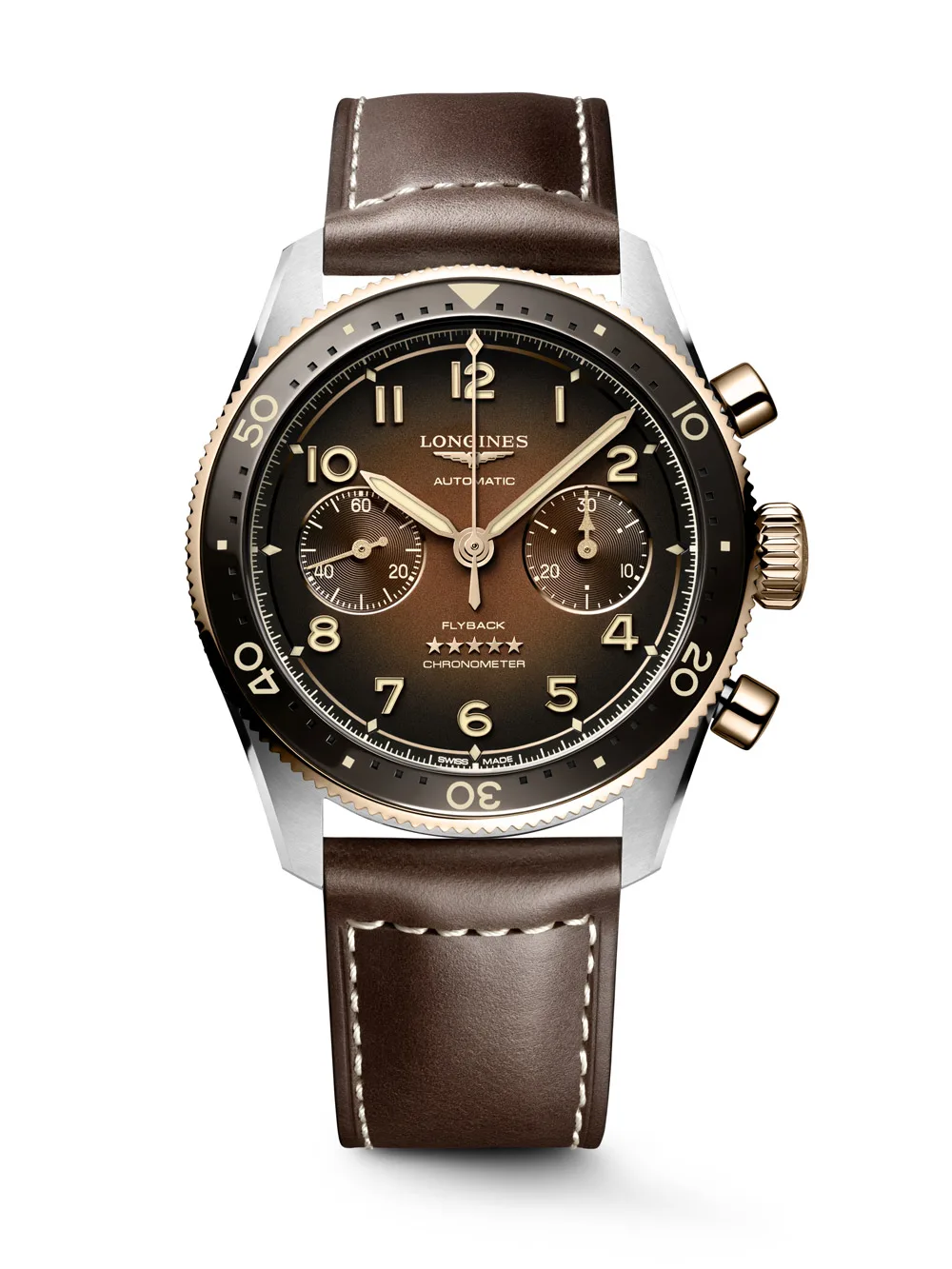 The other model we’re looking at is a chronograph version of the Spirit, of which two distinct versions are available. They’re both stainless steel two-tone watches; one has 18k yellow gold chronograph pushers and crown, along with gold on the bezel, and the other has 18k rose gold ones. Beyond that, they’re nearly the exact same watch although with slightly different dial hues and strap colours. Both pieces have a bulky 42mm x 17mm.