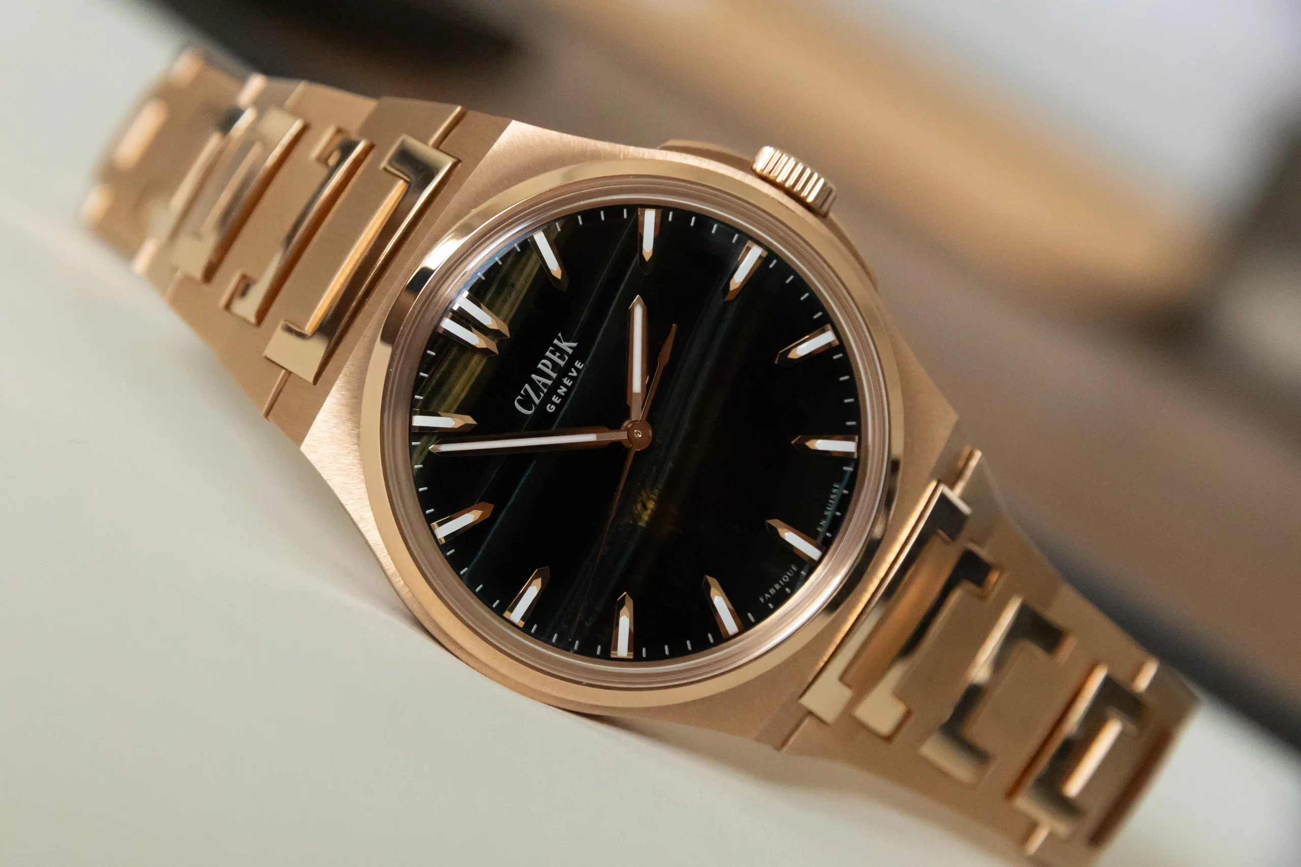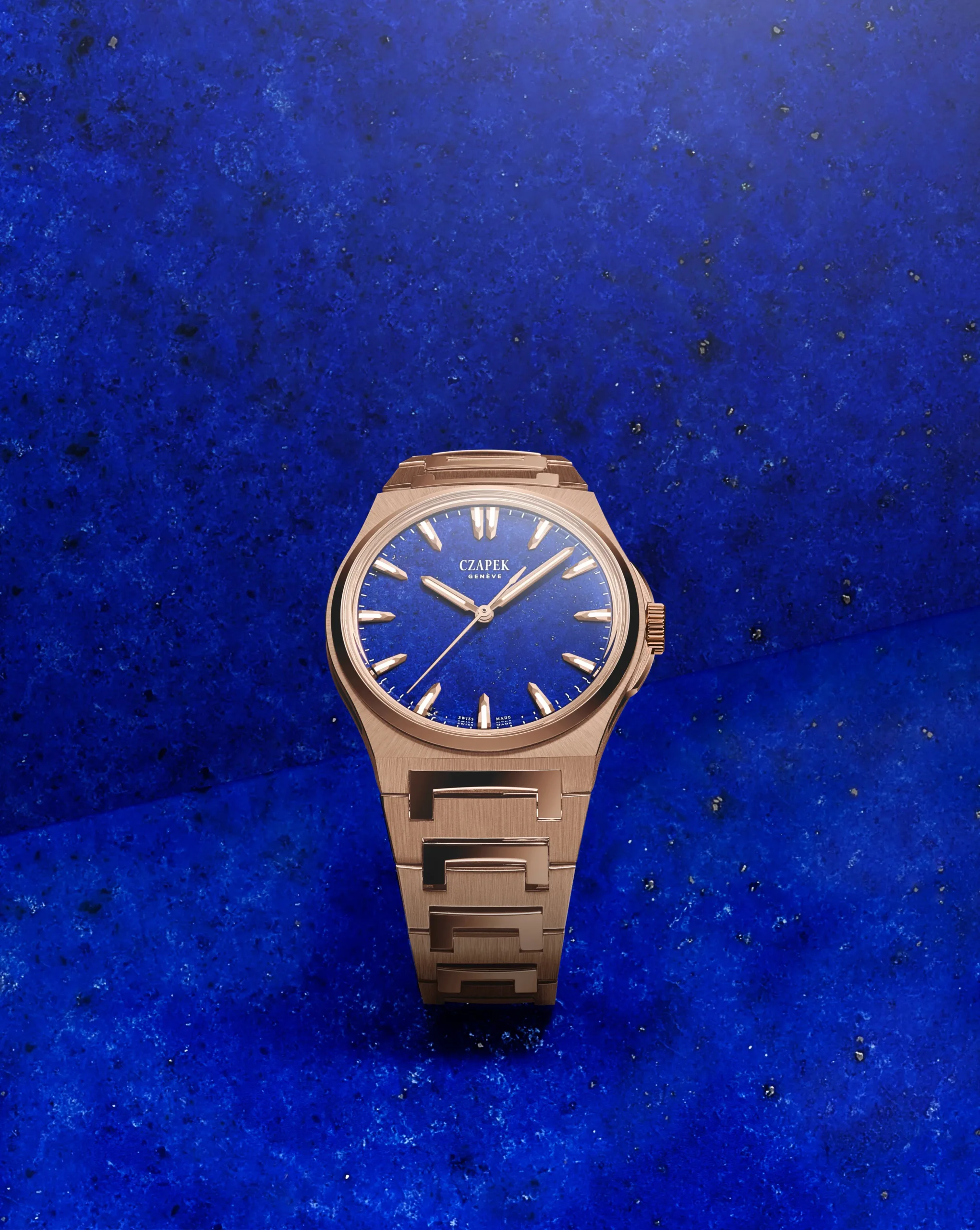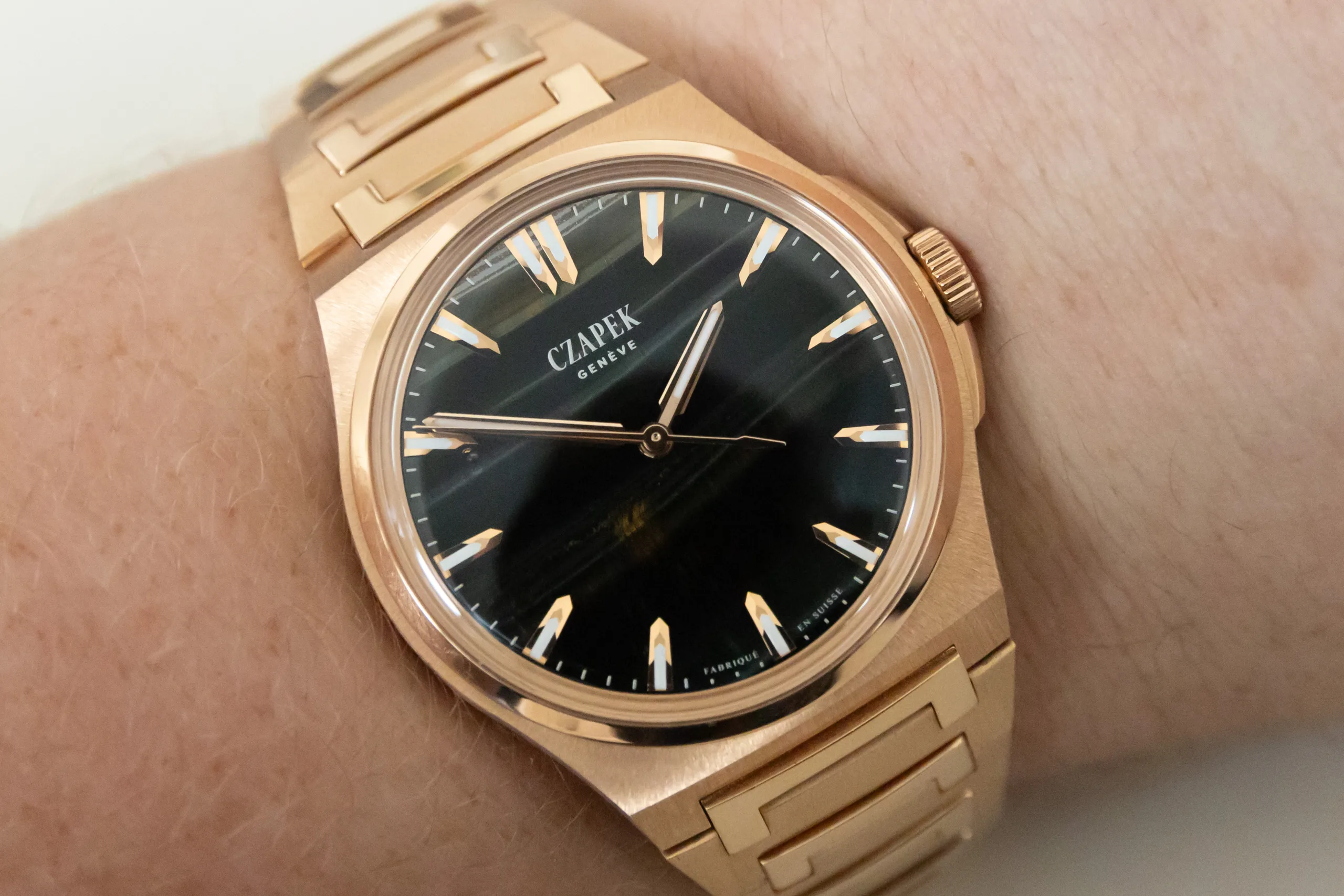 The difficulty of working with such thin pieces of stone on the dials of the watches presented some unique challenges, most notably the date function which the Antarctique usually has. On these watches, you’ll notice, the date has been omitted entirely as cutting out the date window was not an option with these dials. You still get the applied markers with lume in them, and lume in the hands as well, for low-light legibility. As with the other watches, this piece is available on a rubber or leather strap with a gold deployant buckle or on a solid 18k rose gold bracelet with your choice of either polished intermittent links or a fully polished look. Like the Falcon Eye watch, Czapek is limiting production of these watches to just ten a year. The price on either of the straps is CHF43,000, and on the bracelet it’s CHF66,000. All prices displayed in this article exclude VAT.