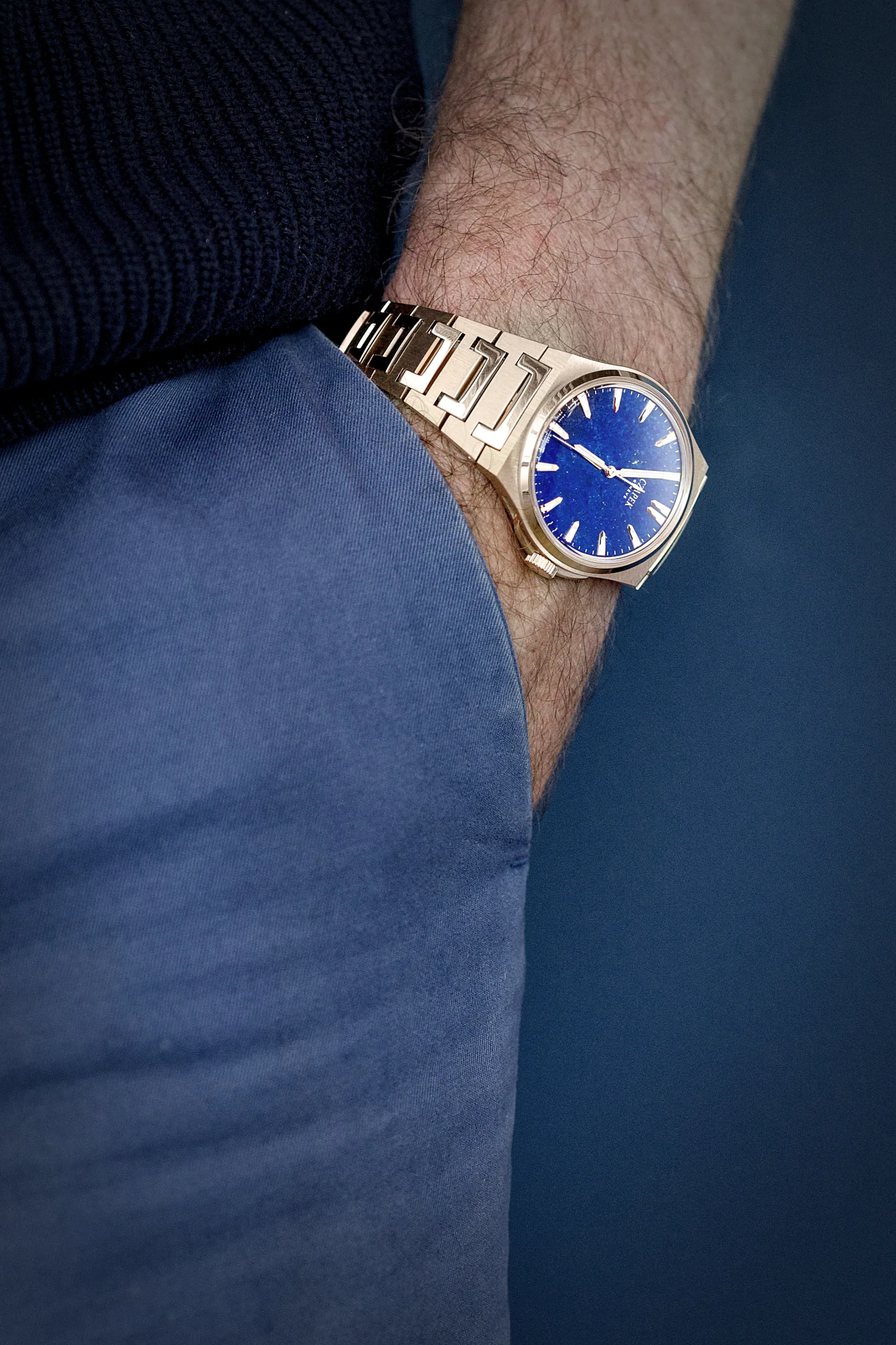 It’s presented in an 18k rose gold case with the same proportions as the Green Meteor watch, which means that it has 120 meters of water resistance so you really can wear the Antarctique wherever you like. I can imagine it by the pool a lot, or on the deck of one of the fancy yachts you might see parked around Venice. This watch also features the calibre SXH5. We really like the futuristic style of finishing Czapek went for with this movement, you’d think that, being a brand about traditions, the movement would look quite traditional too. And yet, the SXH5 with its cut outs, bridges and array of finishings looks set for the future. Unlike the Green Meteor, the Antarctique Falcon Eye is not a limited-edition piece, but they have capped production to ten pieces a year, and they’ll cost CHF39,000 on the rubber/leather strap or CHF62,000 on the 18k rose gold bracelet.