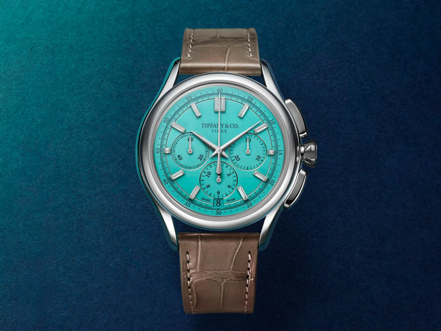 The case is made from platinum and measures 40mm with 100 metres of water resistance. That material choice could have tipped into excess, but the rounded case shape keeps things controlled and wearable. The chronograph pushers follow the case profile and give the crown a bit of protection. Speaking of the crown, it’s faceted to mirror the proportions of Tiffany’s six-prong setting from their jewelry side. Both crown and pushers are white gold, keeping the whole thing monochromatic and refined.