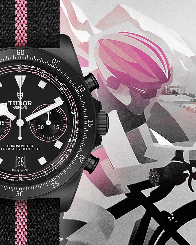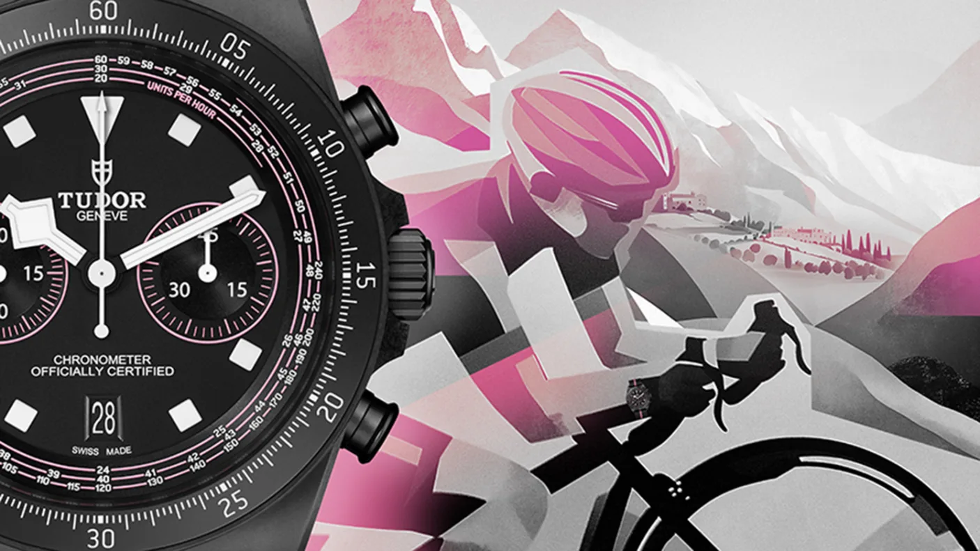 The pink, which extends onto the dial, relates to the “Maglia Rosa” or pink jersey, symbolising victory in the race. The black dial seems legible in the photos Tudor sent us, with the chronograph tachymeter calibrated for calculating the cyclist’s speeds, which is a neat touch.