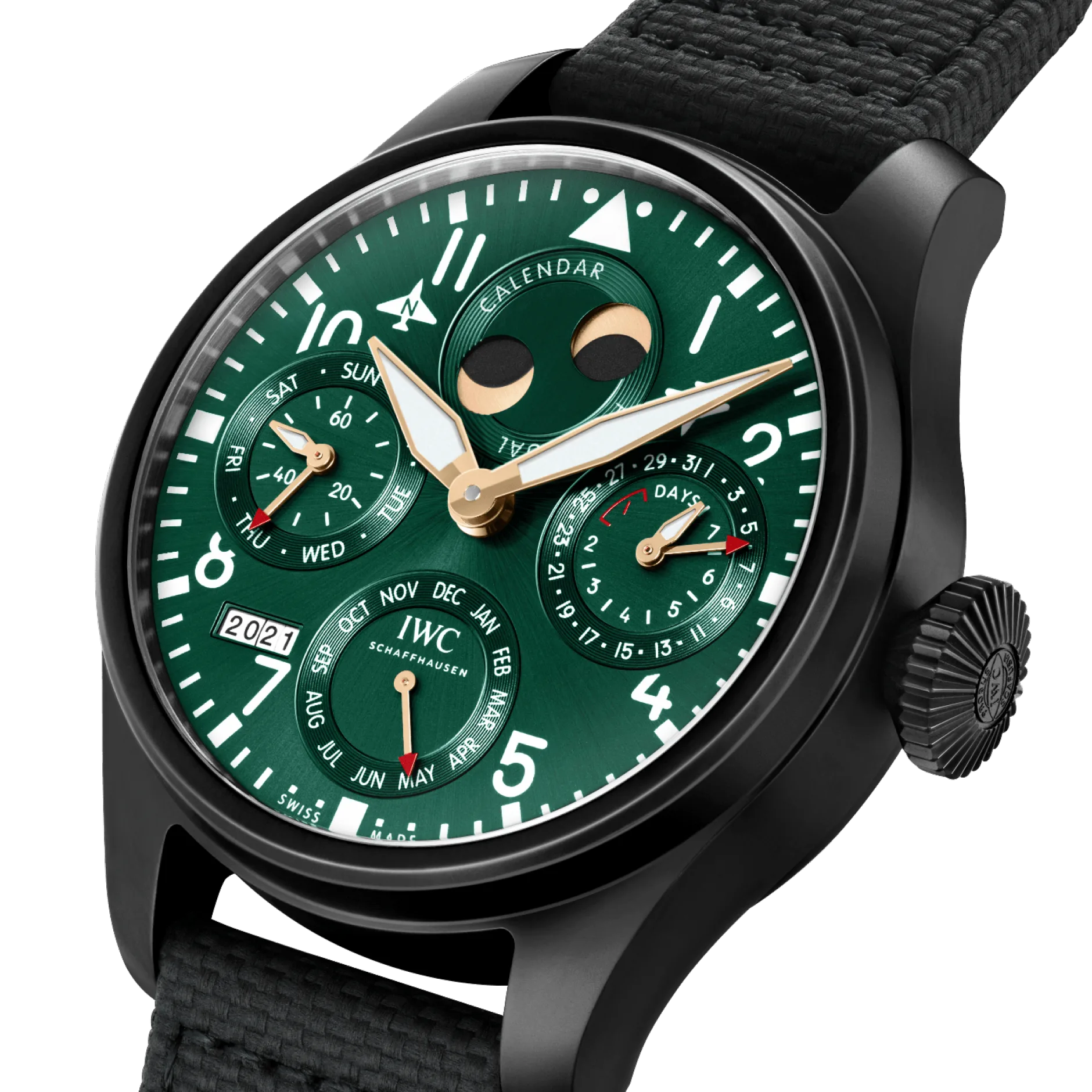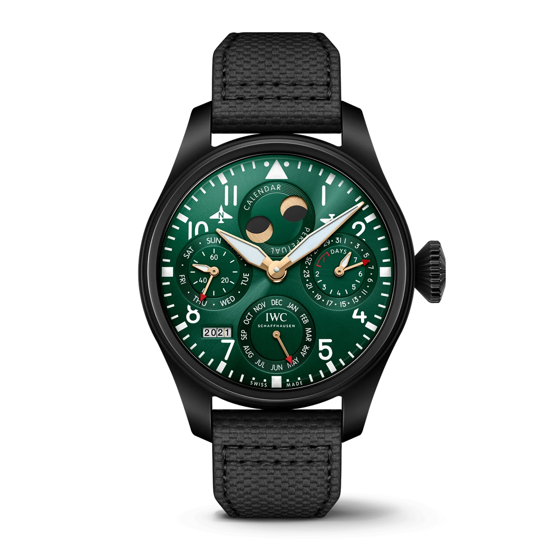 Green is a trending color in the world of horology and IWC has been quick to respond by first releasing the IWC 41 chronograph in green and now the Big Pilots Perpetual Calendar. The shade of green chosen by IWC is vivid and offers a great contrast to the printed white elements on the dial. Like previously released variations, this watch also uses four thoughtfully placed registers to implement the Perpetual Calendar complication.