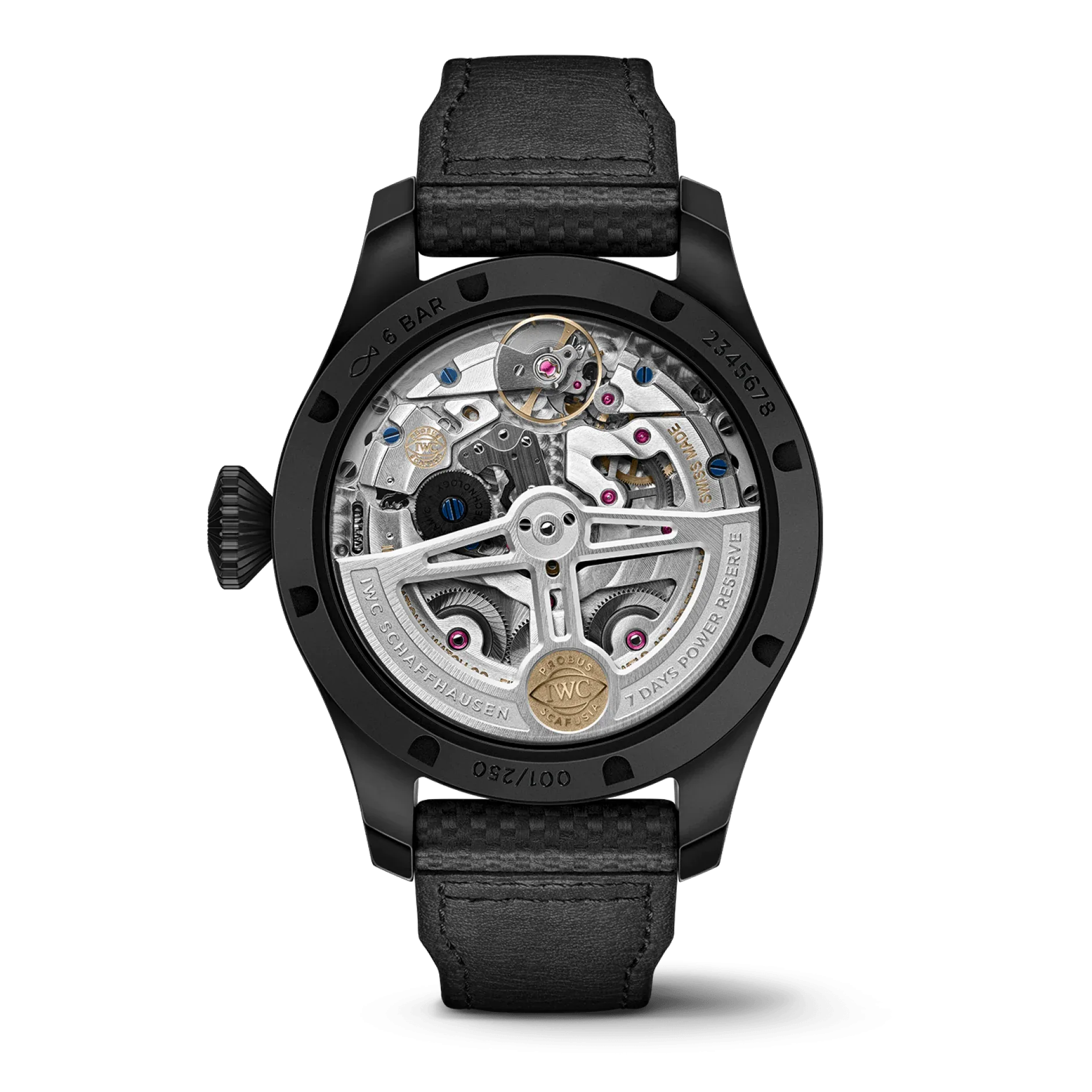 In true Big Pilots fashion, the case measures a large 46mm in diameter and has a thickness of around 15.6mm. It is crafted from black ceramic and is water-resistant to 69 meters, thanks to the threaded oversized onion style crown at 3. The rear of the watch is equipped with sapphire glass that gives an expansive view of the caliber 52615. An automatic movement, the caliber 52615 operates at 4 Hz and offers an autonomy of around 168 hours. It comprises 386 components and 54 jewels. The movement is beautifully decorated using perlage, Geneva stripes, and blued screws. It also comes equipped with an 18 kt skeletonized gold rotor.