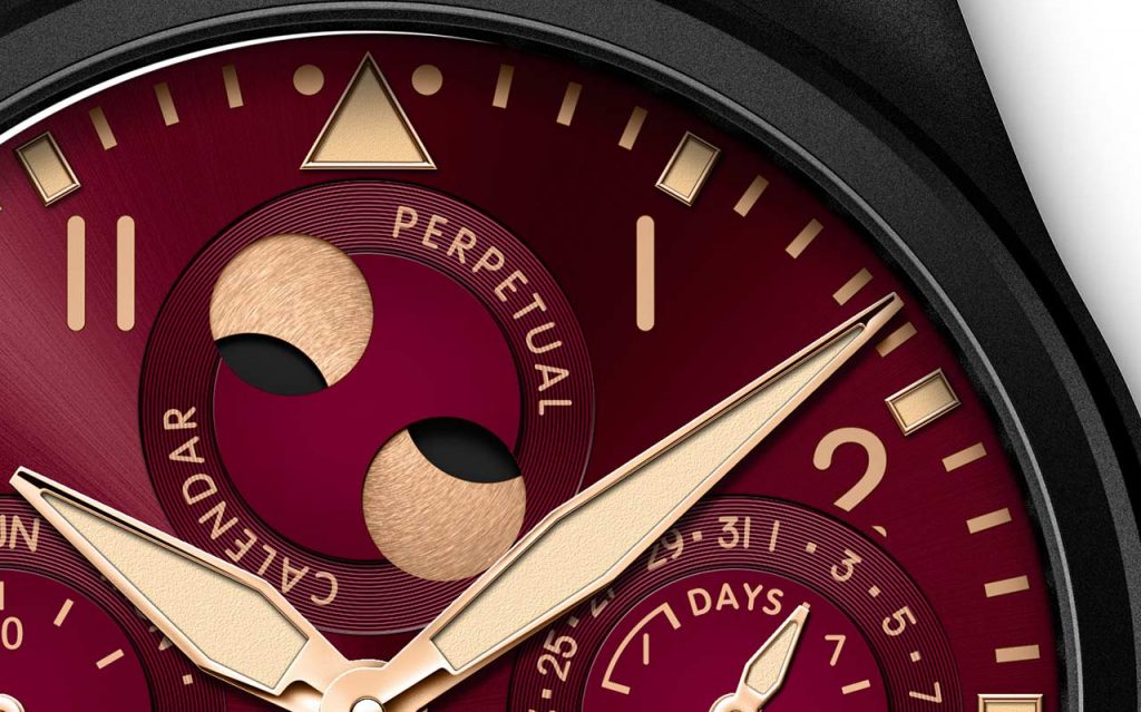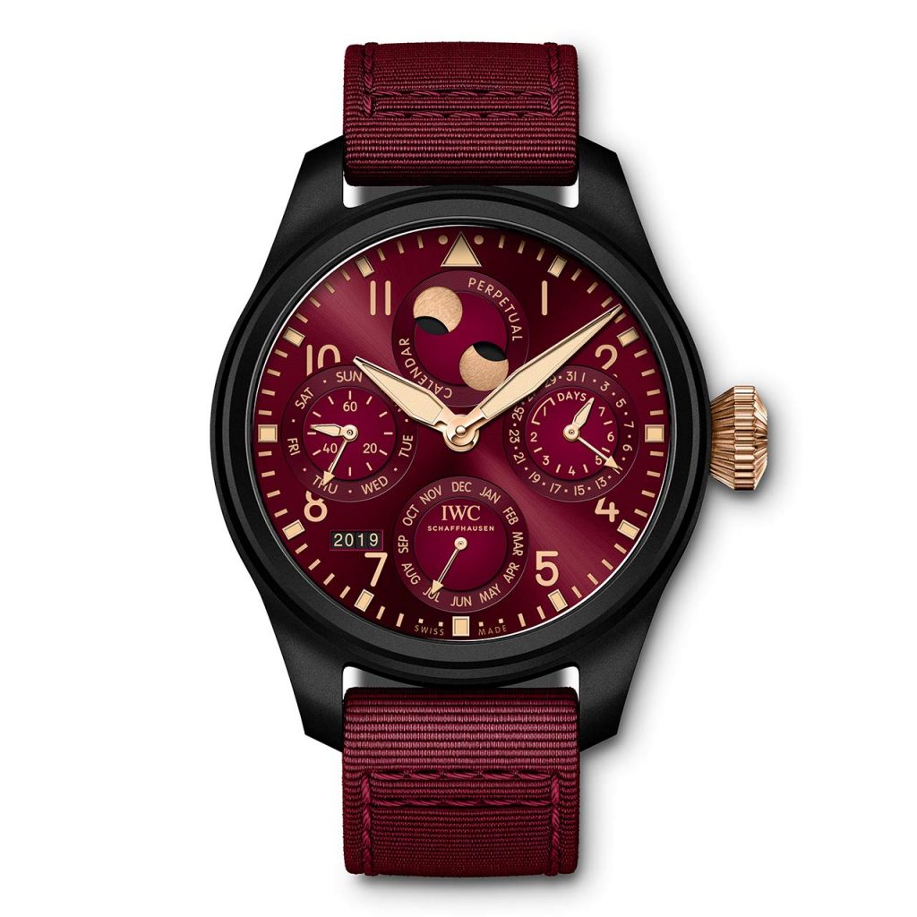 Based on IWC’s Big Pilot Perpetual Calendar watch, Hamilton’s edition features two colours that are known to complement each other exceptionally well when applied correctly. They are black and gold. The black ceramic case features, surprisingly, a burgundy coloured dial with a sunburst finish to it. The textile strap is also burgundy in colour as well. On the dial, we find gold plated hands to match the 18k gold onion style crown, a signature flourish of pilots watches, designed to make interacting with them while wearing gloves easier. The lume also seems to be gold coloured, at least to my poor colour vision anyway.Â