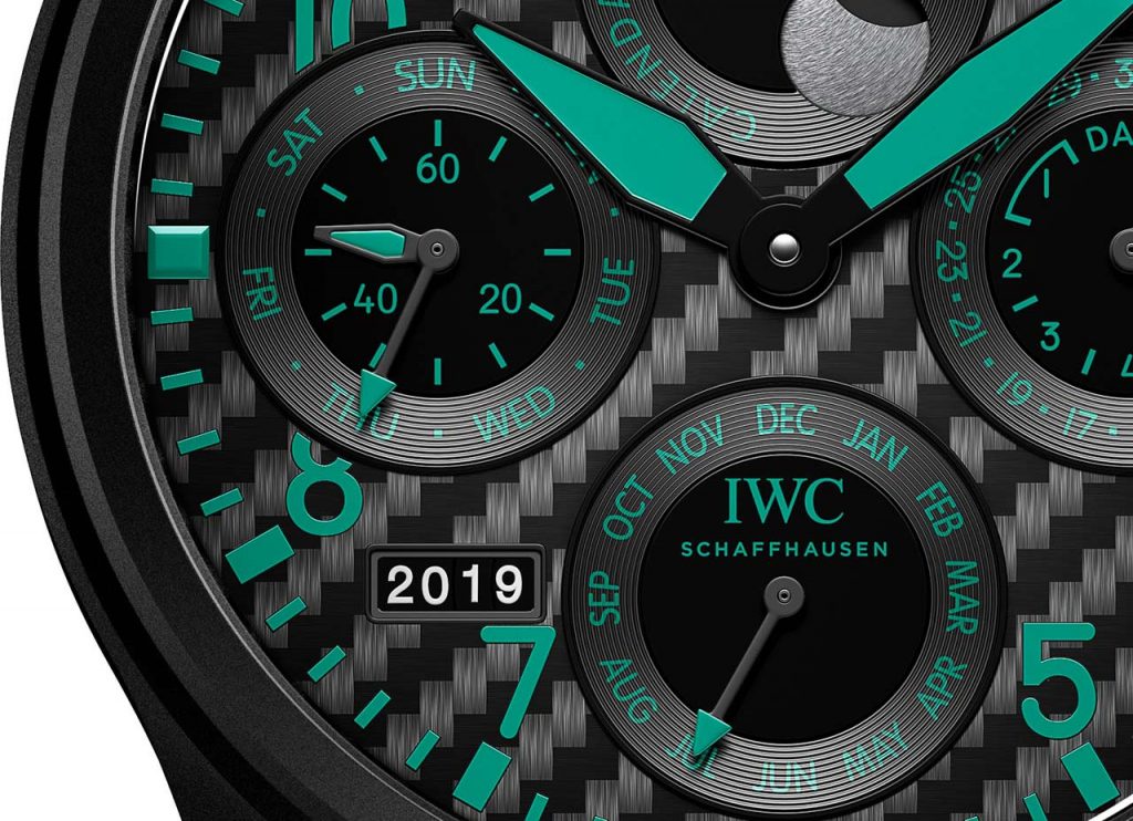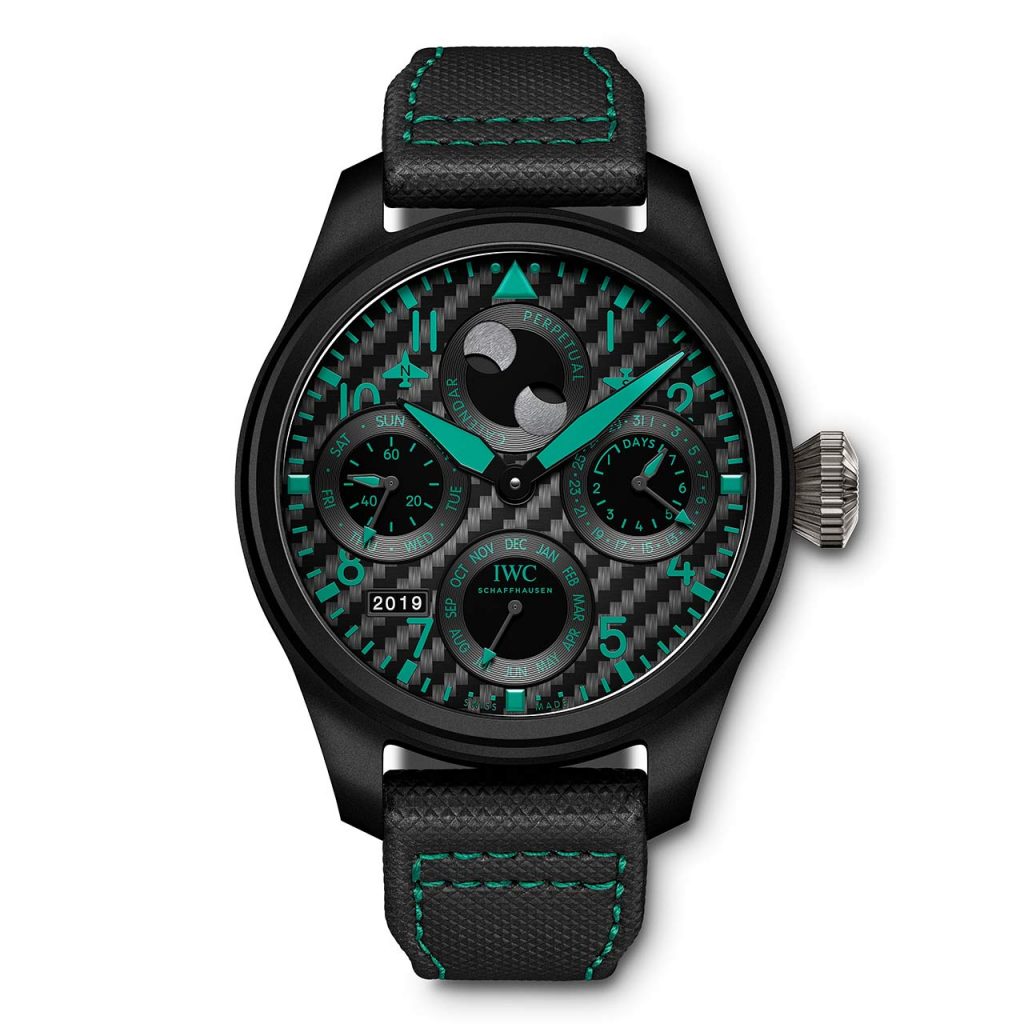 IWC is also releasing an even more limited version of their Big Pilot perpetual watch than the Lewis Hamilton version. Exclusively limited to just 10 pieces worldwide is the “Mercedes AMG Petronas Motorsport” version, which also uses a ceramic case like the “Lewis Hamilton” edition. The dial is made of carbon fibre, a signature of exotic cars and motorsports, and the colours of the accents on the dial are quite dim. Still, they are nevertheless the Petronas Emerald Green colour. It reminds me of Omega’s all-black Speedmaster Dark Side of the Moon, and is very cool-looking in my opinion, though I prefer the contrast of Hamilton’s watch. Priced at $38,000 it is undoubtedly the more affordable of the two, but finding one will be ten times harder.