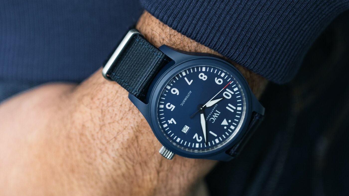 The rounded case of the new piece is 41mm in diameter and made from ceramic which has been coloured blue. The dial is also blue, and the strap (I’d make an Eiffel 65 joke here, but Hodinkee already did that). There isn’t much to the dial. It’s spartan but functional with large markers and hands that have undoubtedly been slathered in lume. There’s a date window at 3 O’clock too. Umm, the end of the seconds hand has been given a red tip for, er, readability, I guess… I’ve run out of stuff to say, let’s move on.