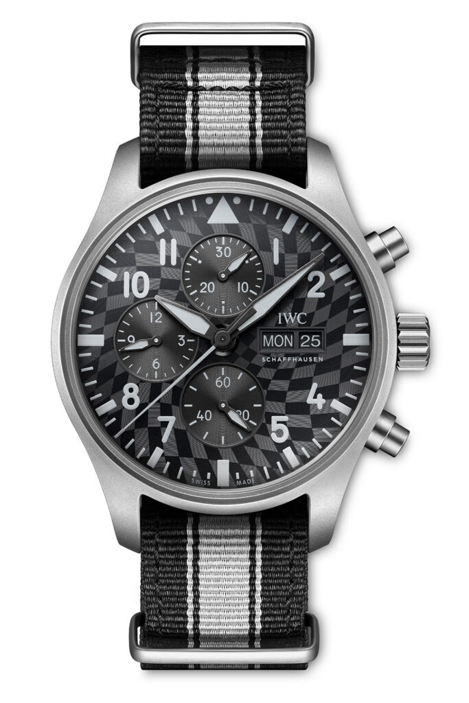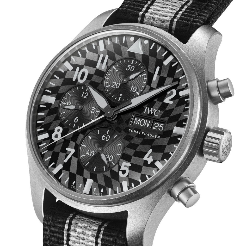 IWC has fitted the dial with a chequered flag to draw attention to the watch’s motorsports history, but it’s given the pattern a twist and a gradient fade to black in the centre, making it look a little like one of those 3D graphics that make you think it’ll pull you into the abyss. Apart from that, there isn’t much different on the front of the watch. It’s still the Pilot’s Watch from IWC that we’re used to. It has a 43mm matte titanium case with a day/date setup and a 3-6-9 chronograph layout.