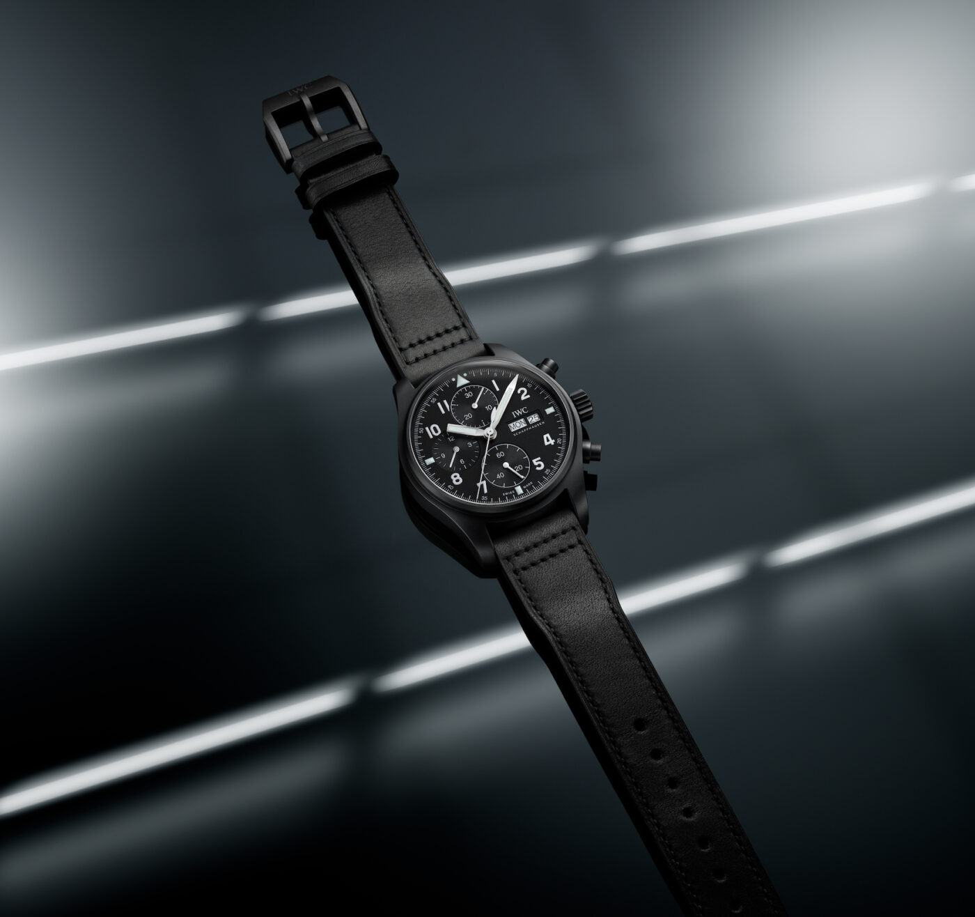If IWC were to say this was a re-creation of the Ceramic Fliegerchronograph, we could laugh at them all day because the watches are different when side by side. Sure, both watches are black, but whereas the original is ceramic, the new watch is made of Ceratanium (and 41mm in diameter), an in-house made blend of ceramic and titanium that aims to combine the strength and lightweight factors of both materials. The crown and pushers are also made of this stuff. And the dial is pretty different as well, although the triangular 12 O’clock marker remains along with the Arabic, which have been given a SuperLumiNova coating for easy legibility at night.