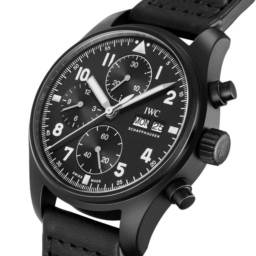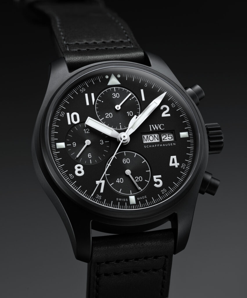 If IWC were to say this was a re-creation of the Ceramic Fliegerchronograph, we could laugh at them all day because the watches are different when side by side. Sure, both watches are black, but whereas the original is ceramic, the new watch is made of Ceratanium (and 41mm in diameter), an in-house made blend of ceramic and titanium that aims to combine the strength and lightweight factors of both materials. The crown and pushers are also made of this stuff. And the dial is pretty different as well, although the triangular 12 O’clock marker remains along with the Arabic, which have been given a SuperLumiNova coating for easy legibility at night.