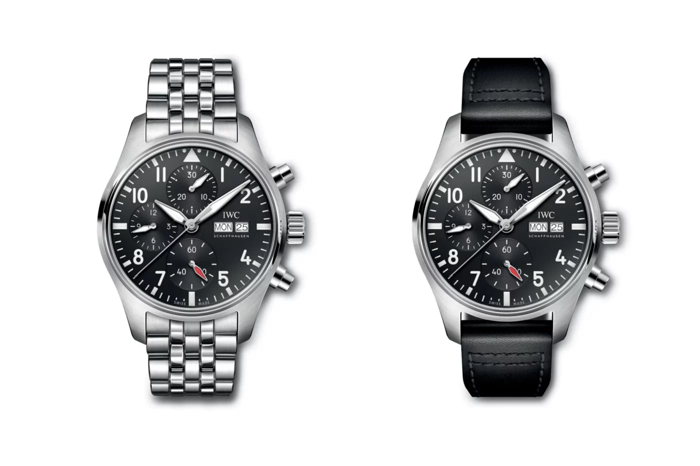 A 41mm Pilot’s Watch was issued a couple of years ago, but only in blue and green. Now, the 41mm version comes with a black dial and strap, which is the favourite combination for watch enthusiasts. The stainless steel case is 41mm x 14.6mm and water resistant to 100m (although operating the chronograph underwater is not a good idea). The steel case features brushing and polishing for a classy yet technical appearance.