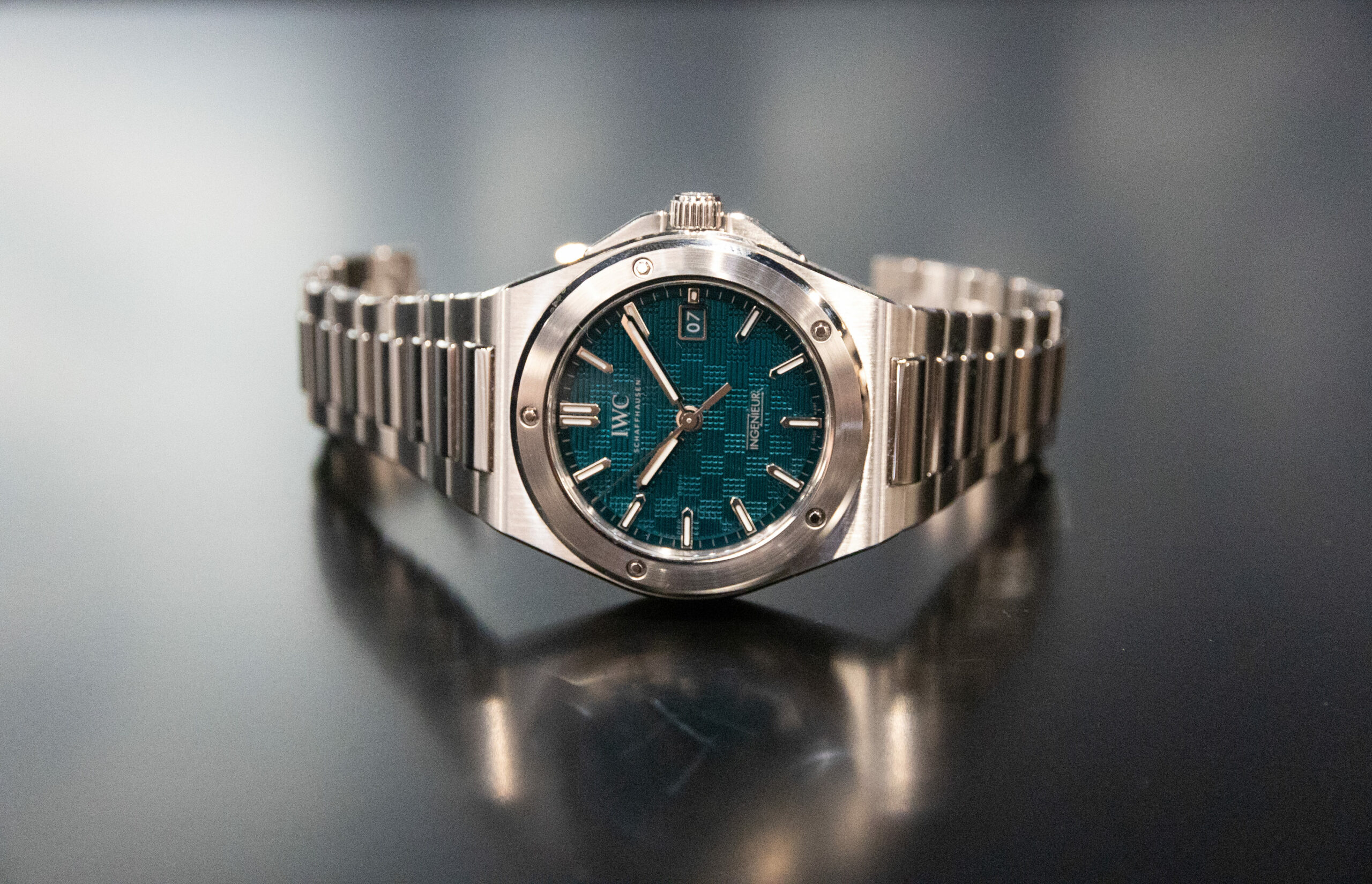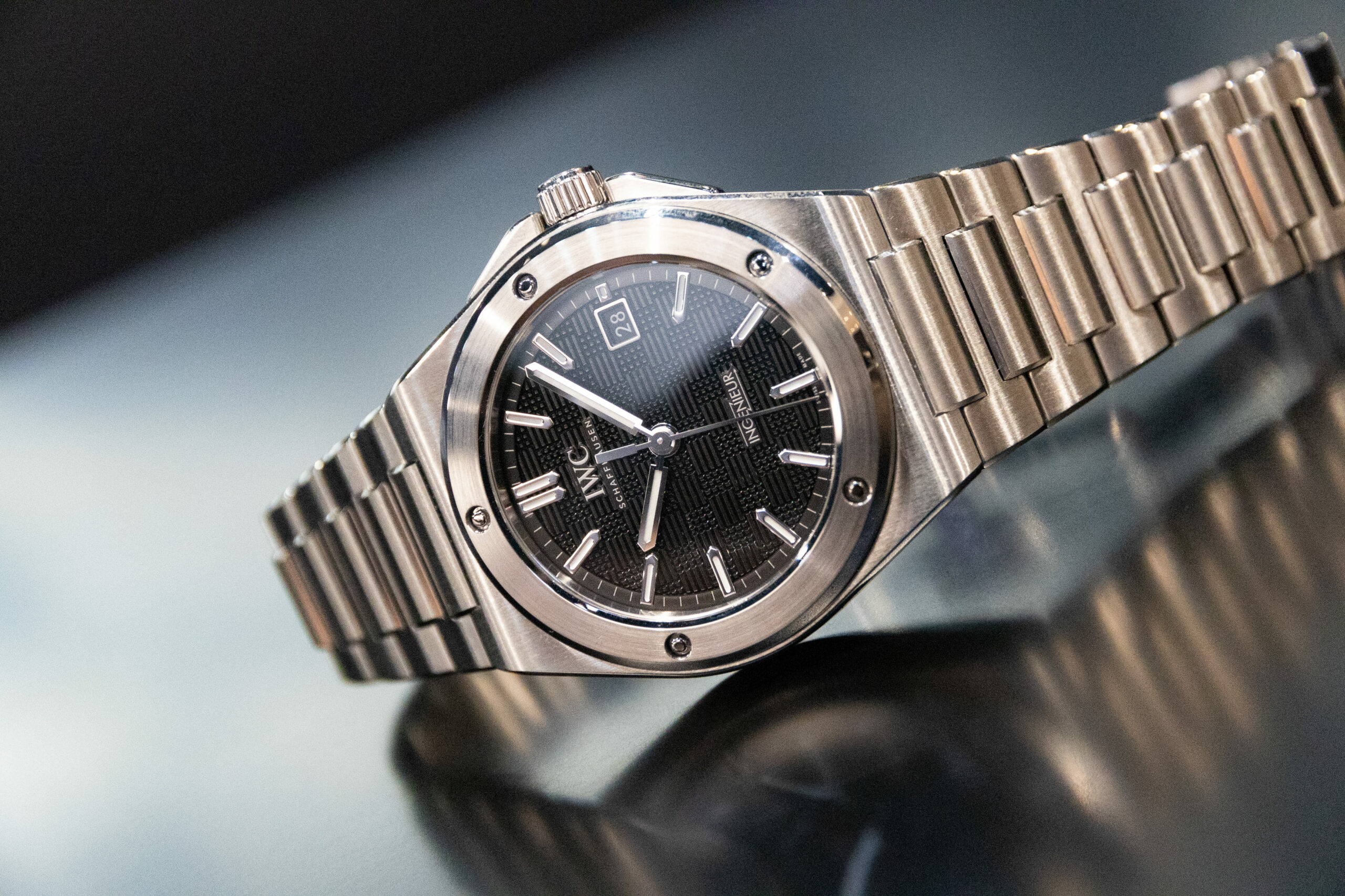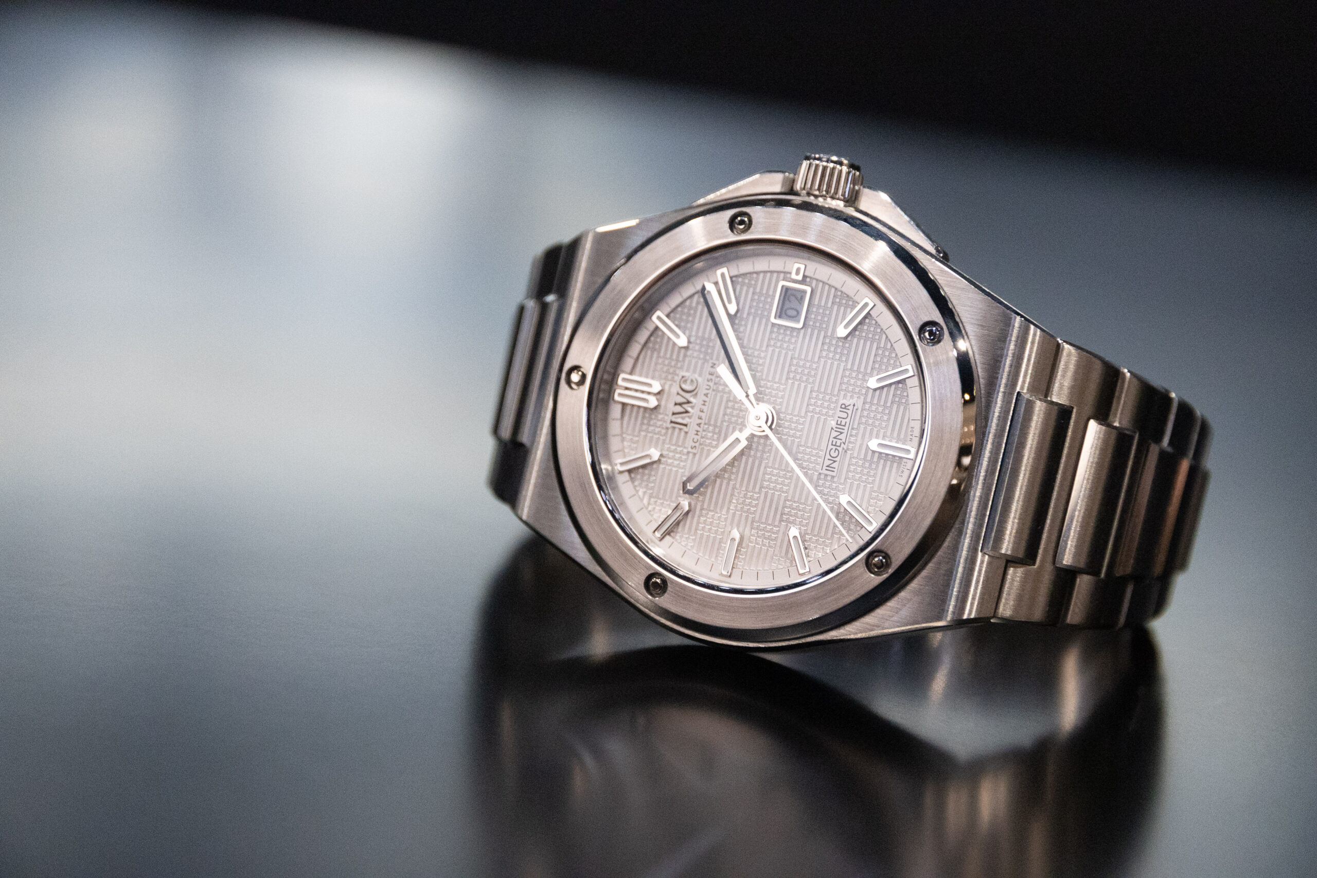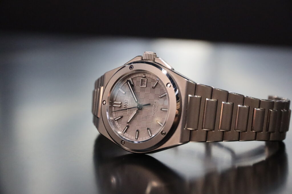 Despite the finish being “industrial”, which to me conjures images of CNC machines doing every task, the Ingenieur has a top-quality feel to it. The brushing of the bezel, case and bracelet catch the light in just the right way, and the polished hands and markers add to the sparkle-fest. The texture of the dial is quite similar to that of Genta’s Ingenieur, although it looks to have been enlarged for the new model.