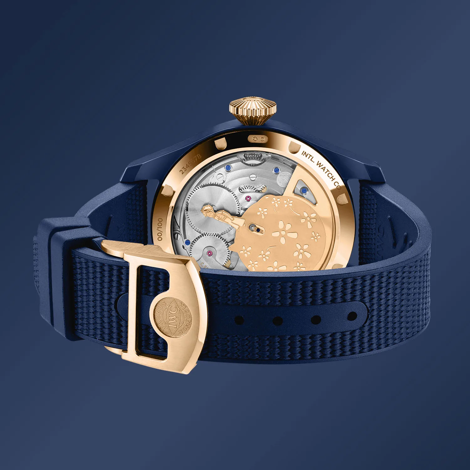 This isn’t your average Big Pilot. Sure, it’s still a wrist-filling 46.5mm across and 16.18mm thick, but now the whole case is made from matte blue ceramic, which keeps the weight down and ups the cool factor significantly. Add a 5N rose gold crown and caseback ring into the mix, and you’ve got a combo that’s part cockpit, part crown jewel.