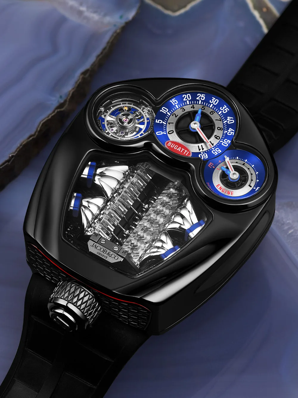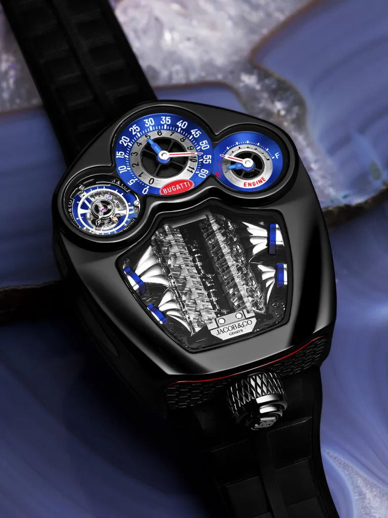 In essence, it’s a watch designed for gearheads who also like horological marvels. Its robust black rubber strap, like Bugatti’s tires, ensures a secure fit even at high speeds. However, such technical excellence comes at a cost; the Jacob & Co. Bugatti Tourbillon is a limited edition of 150 pieces, priced at $340,000 each.