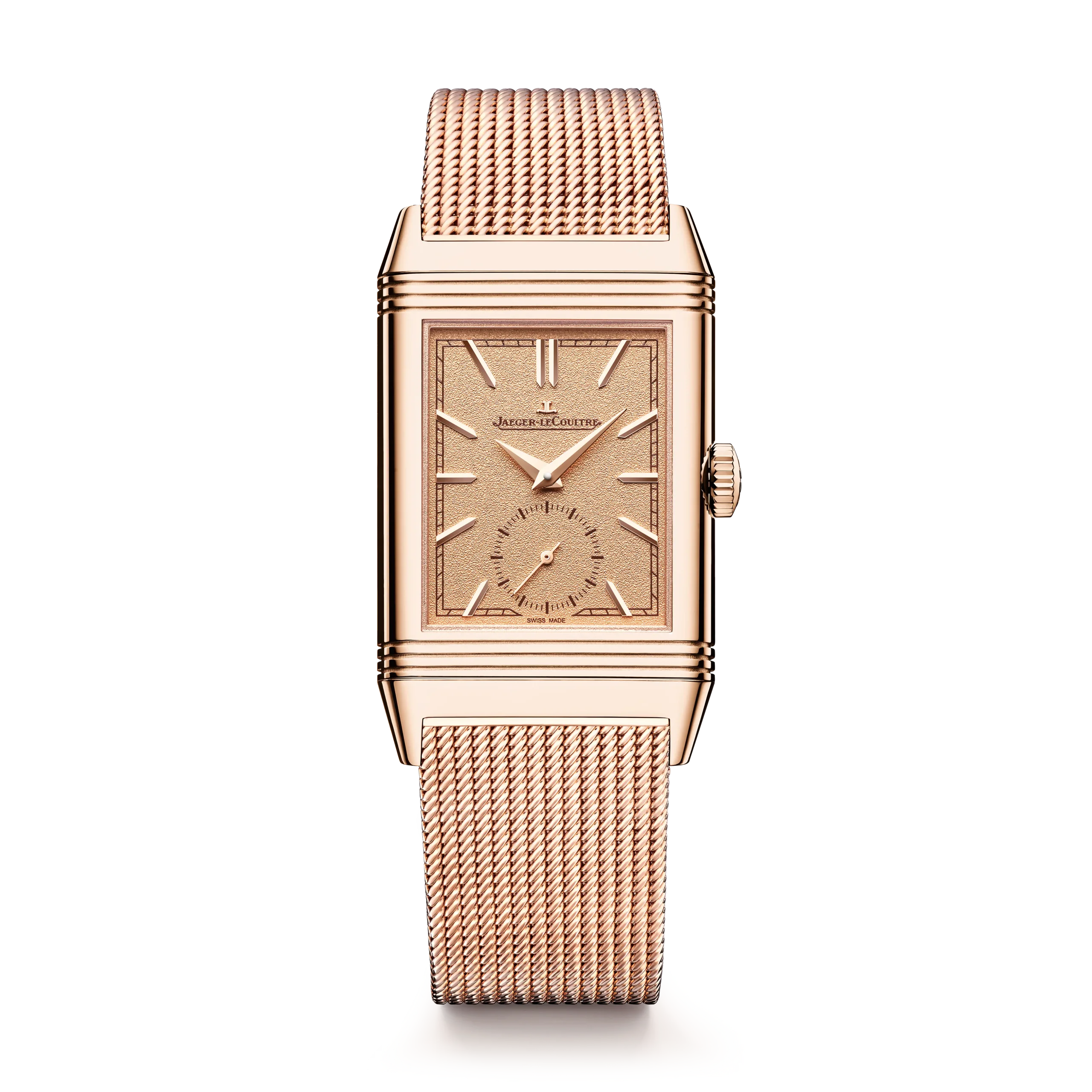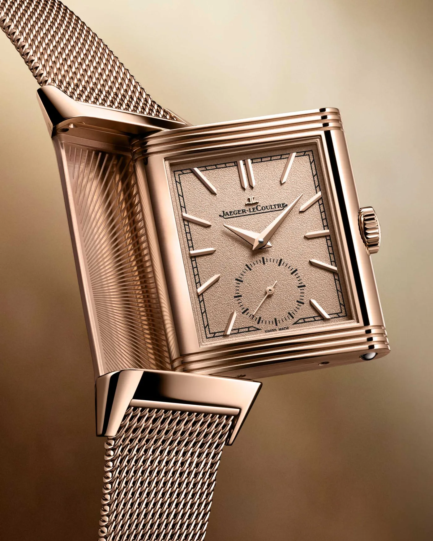 It steps into the limelight encased in 27.4mm x 7.56mm x 45.6mm 18-karat pink gold. The dial, swathed in a grained pink gold finish, presents a rather fetching texture. Inside its metallic carapace ticks the JLC caliber 822, a manually wound engine with a respectable 42-hour power delivery. This gilded ticker is affixed to a matching 18-karat pink gold Milanese bracelet, complete with a sliding clasp. Priced at $41,300, this iteration isn’t a limited run and is seemingly here to stay.