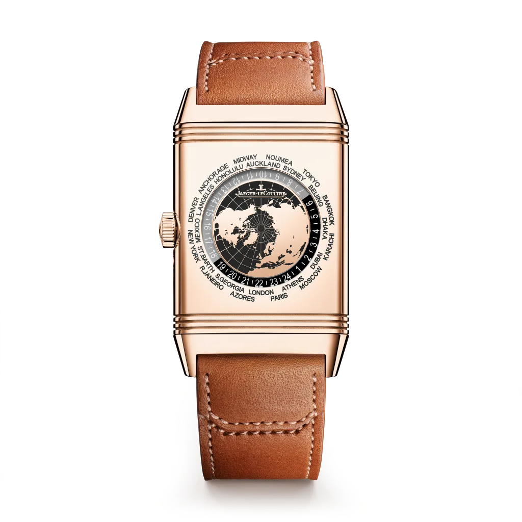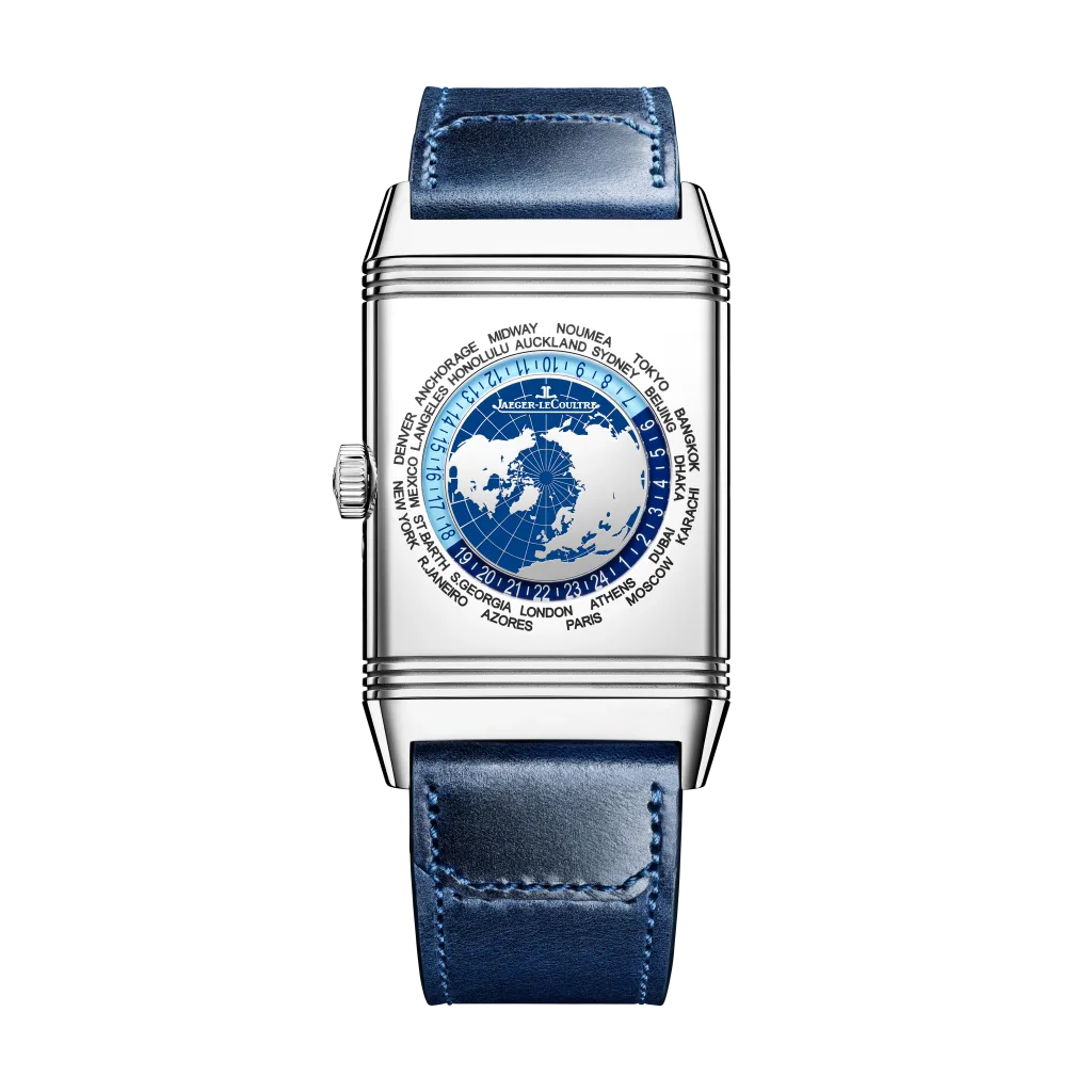 The steel version is tagged Q714845J, and the pink gold Q714256J is in 29.9mm x 49.4mm x 11.14mm size. The steel variant features a blue sunburst dial with applied indices and a big date display, and the pink gold limited edition (capped at 150 pieces) sports a brown counterpart. Flip the case, and you’ll find a laser-engraved world map, hand-lacquered oceans, and a rotating 24-hour ring underneath a transparent window.