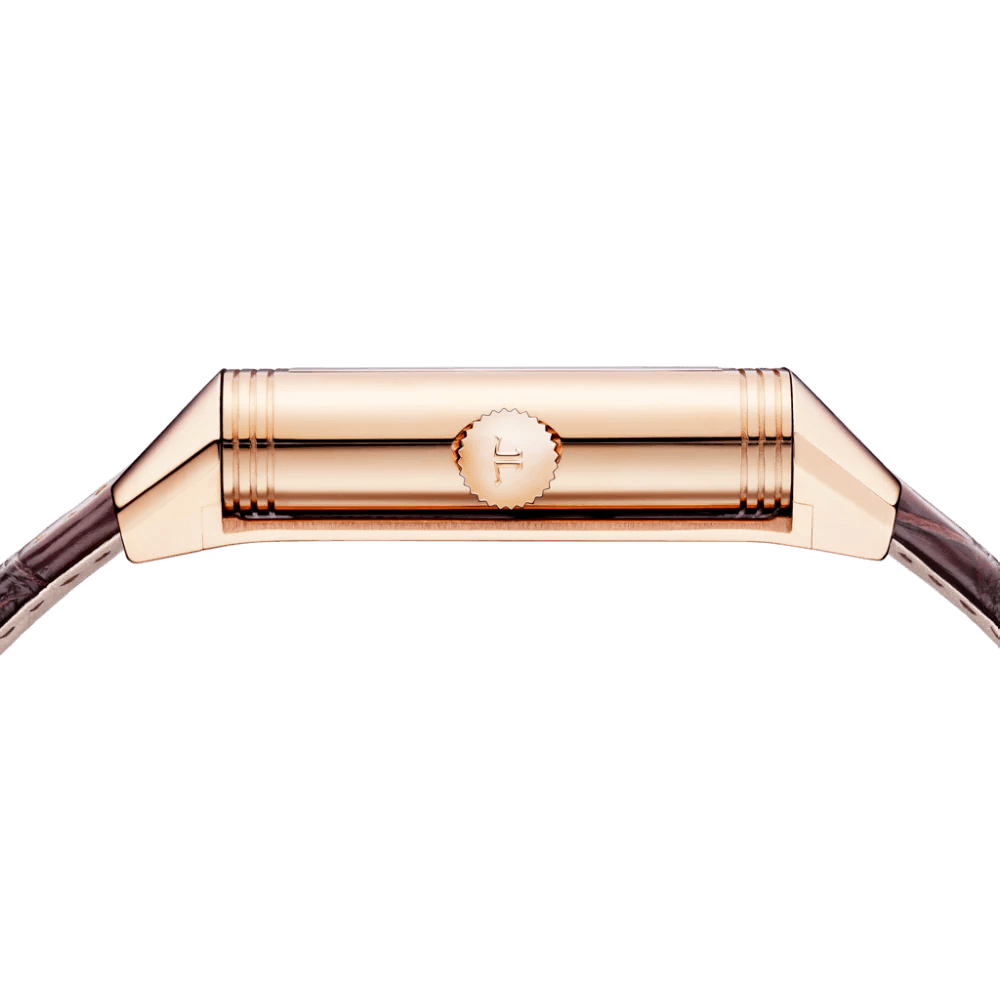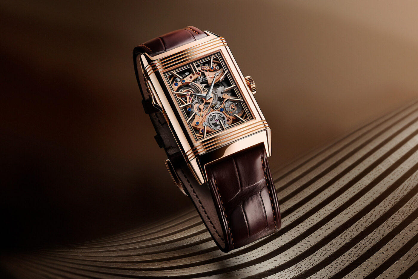 Jaeger-LeCoultre removed the dial on this piece for technical reasons. You see, it’s not just a pretty face. Removing the dial plate removes a sound insulator from the watch, allowing the minute repeater to chime louder and more clearly. The extra-large hammers and gongs work to produce a pitch-perfect sound, and the gongs themselves are attached to the front crystal, using that as an amplifier of sorts for the sound. The case features the classic Art Deco style markers and train track indices to keep the watch legible. The Jaeger-LeCoultre logo has been printed onto the crystal.