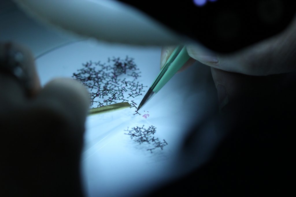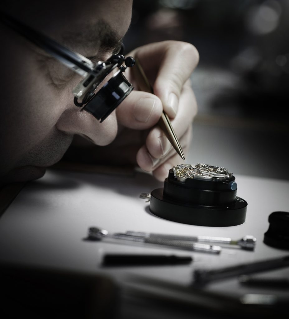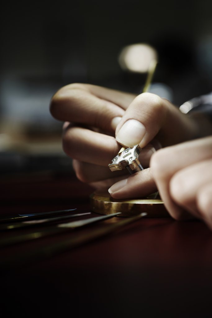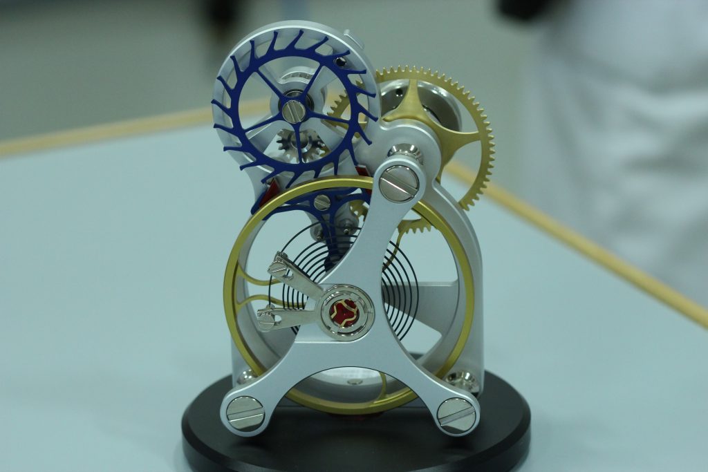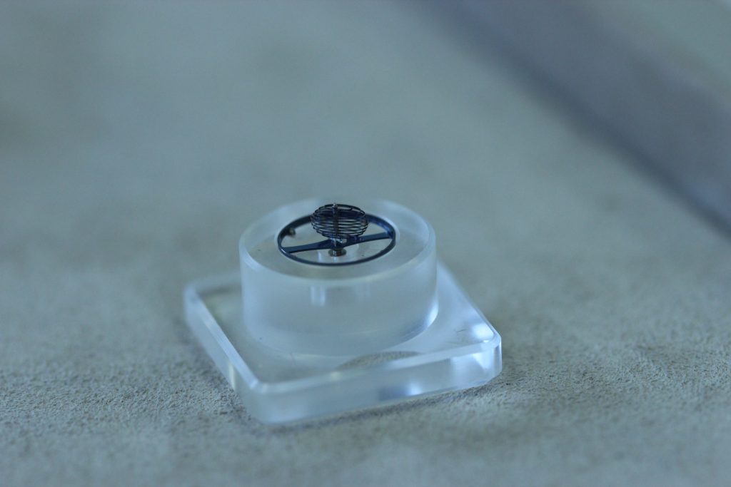 After some more walking about we find ourselves in the quiet laboratory like setting where the balances are prepared. We are given a full demonstration of how the JLC anchor balance works with the help of a model. As this is happening, the watchmaker behind us asks if we would like to observe as the pallet stones are attached to the anchor escapement.