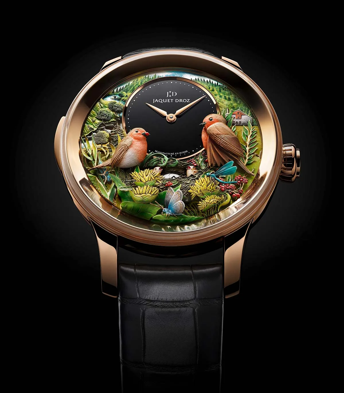 The dial of the Bird Repeater 300th edition is beautiful, and it encompasses some of the key parts of the views around La Chaux-de-Fonds, where watchmaking happens. To the left of the time dial is a river valley view with trees, reminiscent of the panoramic views around La Chaux-de-Fonds. To the right, a small farmhouse sits in a meadow. This is a recreation of the farmhouse Pierre Jaquet-Droz was born in 300 years ago. Two robins are perched on a nest that contains an egg which, when the minute repeater is activated, opens to reveal a chick. The robins’ wings also move. The nest of the robins is perched in the middle of a small clearing where flowers and frighteningly out-of-proportion (but beautiful) butterflies and dragonflies live. Horticulturalists will be pleased to know the flowers depicted are real, and they’re based on the Gentian Gentiana Lutea, or Great Yellow Gentian. We’ve linked to a video by Jaquet Droz of a watch similar to this one in action, take a look.