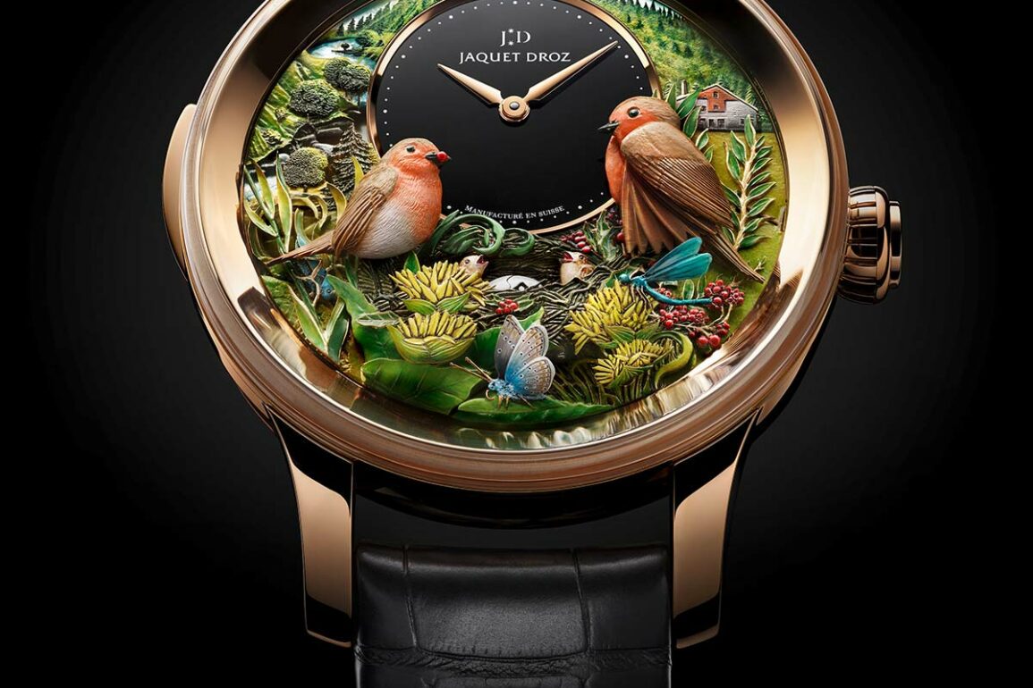 The dial of the Bird Repeater 300th edition is beautiful, and it encompasses some of the key parts of the views around La Chaux-de-Fonds, where watchmaking happens. To the left of the time dial is a river valley view with trees, reminiscent of the panoramic views around La Chaux-de-Fonds. To the right, a small farmhouse sits in a meadow. This is a recreation of the farmhouse Pierre Jaquet-Droz was born in 300 years ago. Two robins are perched on a nest that contains an egg which, when the minute repeater is activated, opens to reveal a chick. The robins’ wings also move. The nest of the robins is perched in the middle of a small clearing where flowers and frighteningly out-of-proportion (but beautiful) butterflies and dragonflies live. Horticulturalists will be pleased to know the flowers depicted are real, and they’re based on the Gentian Gentiana Lutea, or Great Yellow Gentian. We’ve linked to a video by Jaquet Droz of a watch similar to this one in action, take a look.