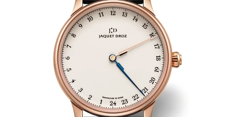 This innovative display is enhanced by the two hands in a compass-like formation. The red gold hand shows local time whereas the blued steel hand gives time in the wearer’s country of choice. By opting for the unconventional system of a single crown to adjust both hands, Jaquet Droz has succeeded in making the Grande Heure GMT simplicity itself.