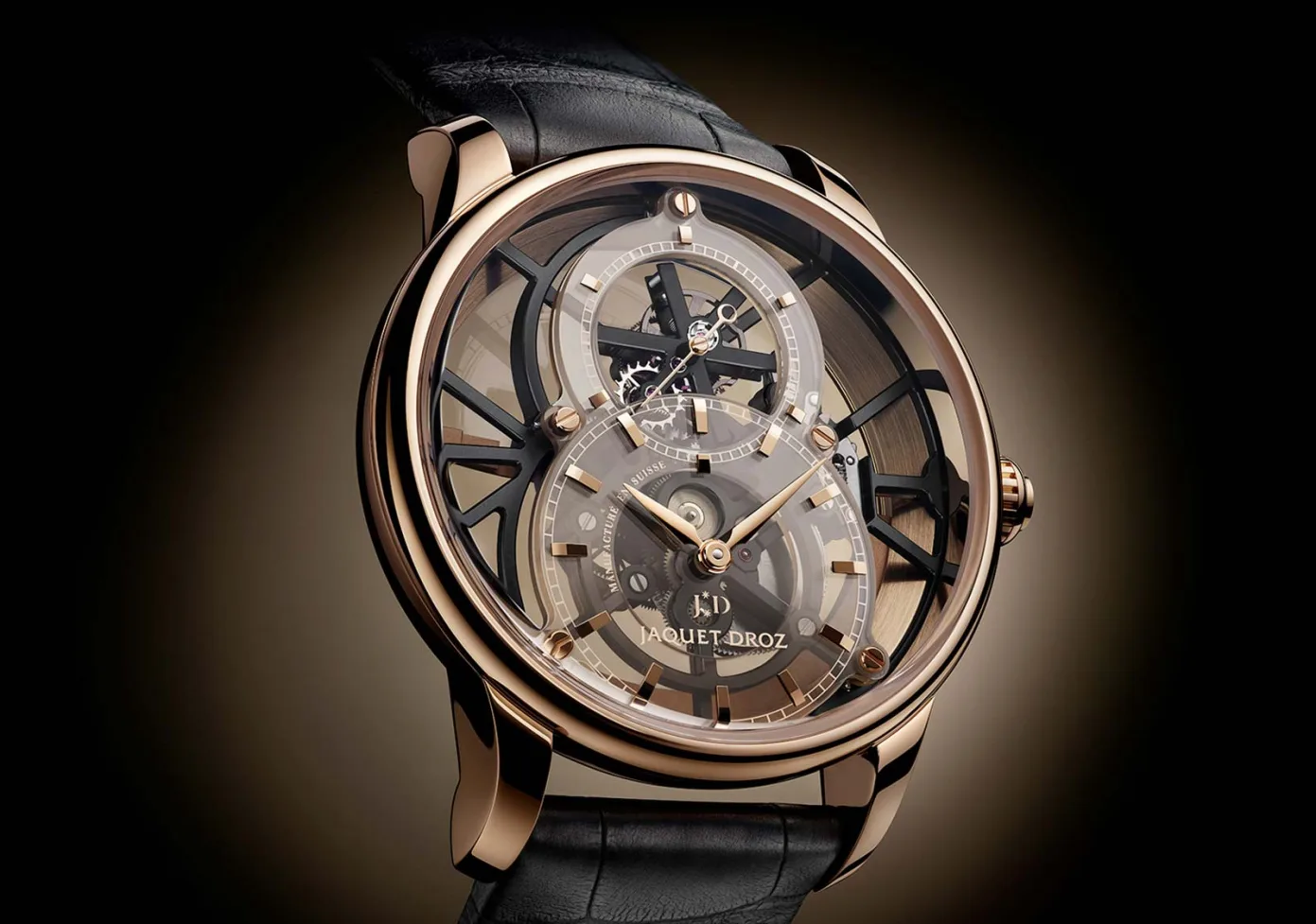 The new Jaquet Droz Grande Seconde Skelet-One Tourbillon comes attached to a genuine black alligator strap with a red-gold folding buckle and retails for CHF 156,000.
