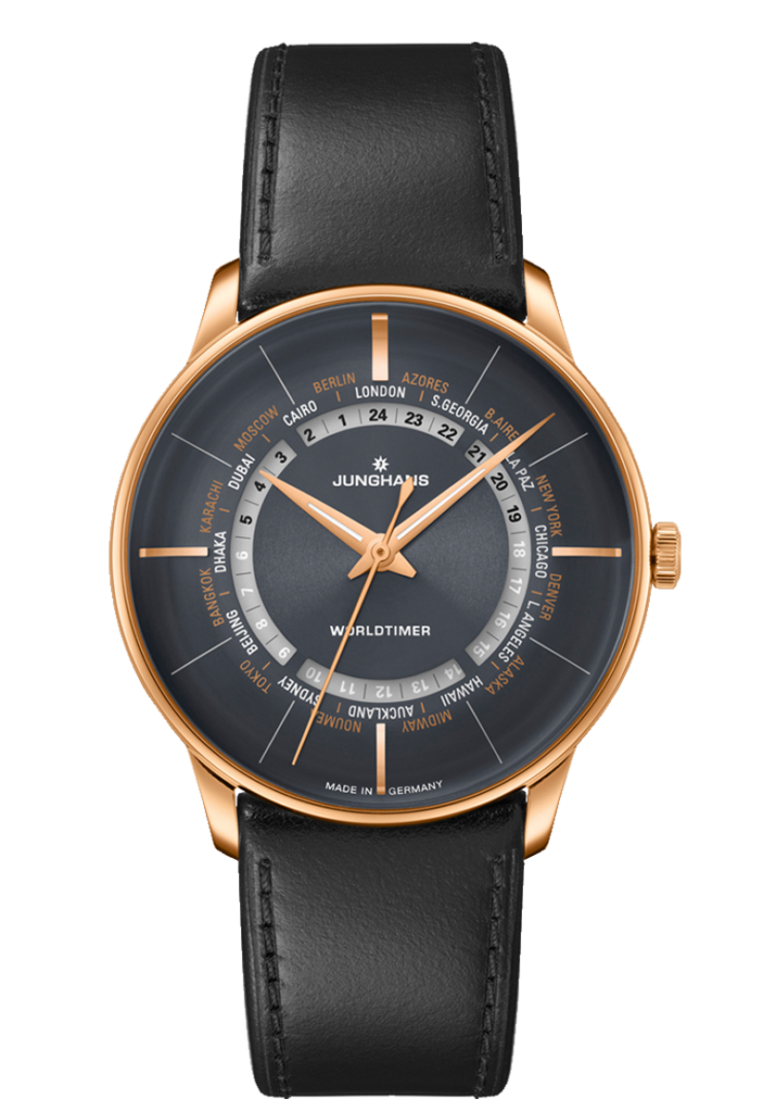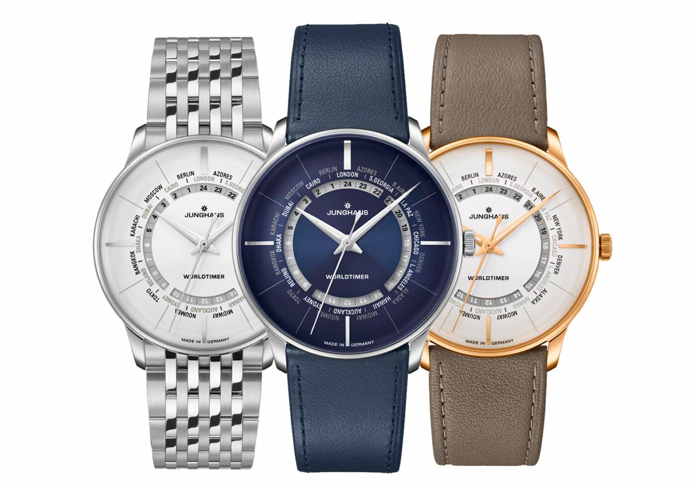 The Junghans Meister Worldtimer comes attached to a blue, black, or light brown strap, or a stainless-steel bracelet, depending on the color of the dial. Prices range between EUR 1,490 and EUR 1,790.