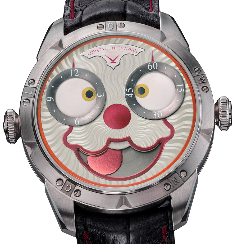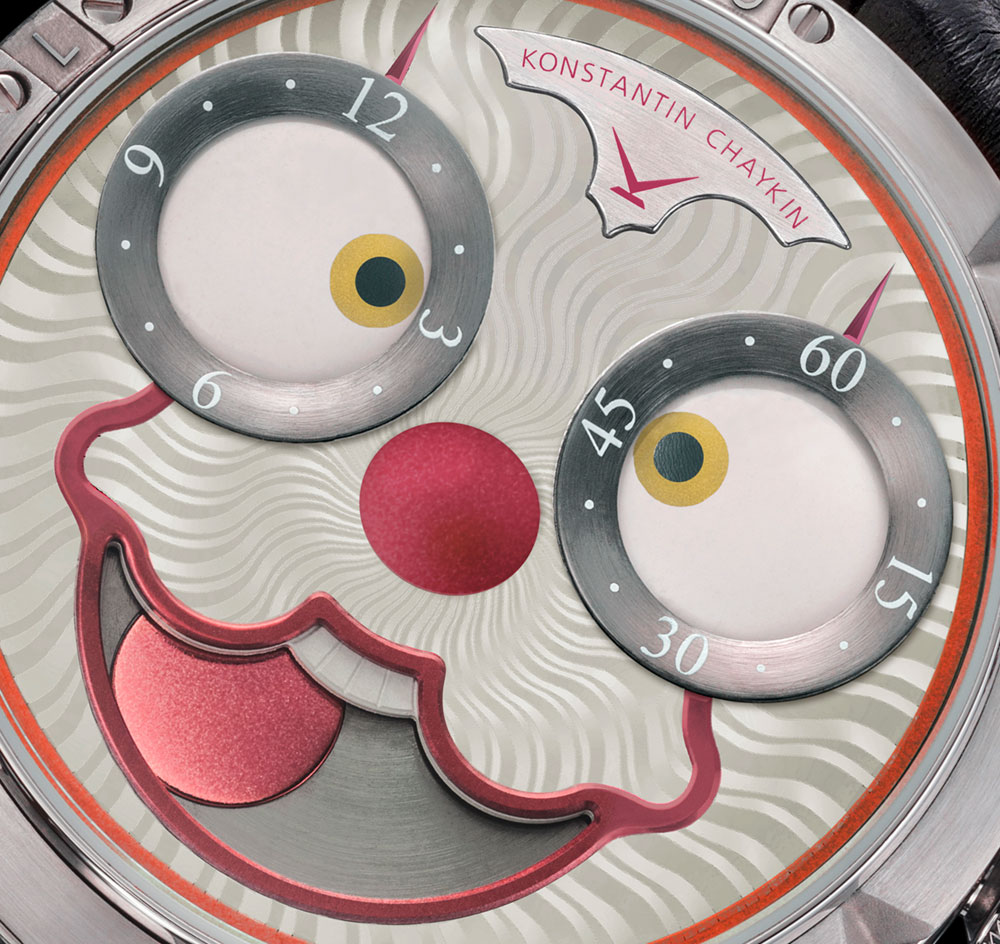 Now, trolling around online I got the impression people misunderstood me when I put the Joker watch in our Top 5 Most Ridiculous Watches (Konstantin Chaykin didn’t mind you), it’s not that I don’t like it, I think it’s extremely creative and a great example of the flexibility of an ETA movement. But the whole creepy face thing wasn’t me, I never liked clowns. Unfortunately, this didn’t go brilliantly as the new ‘Clown’ watch is, as expected, even more colourful. For instance, the main dial plate is now a more creamy colour to simulate the makeup used by the colourfully off-putting entertainers. The guilloché down between the eyes has been replaced by a big red nose you just want to push and hear a squeaky noise. Perhaps most unsettling is that it’s now more realistic, the eyes have green coloured irises now too and instead of the symbols from a deck of cards engraved in the bezel, it now spells ‘CLOWN’ instead, in case you did manage to forget.